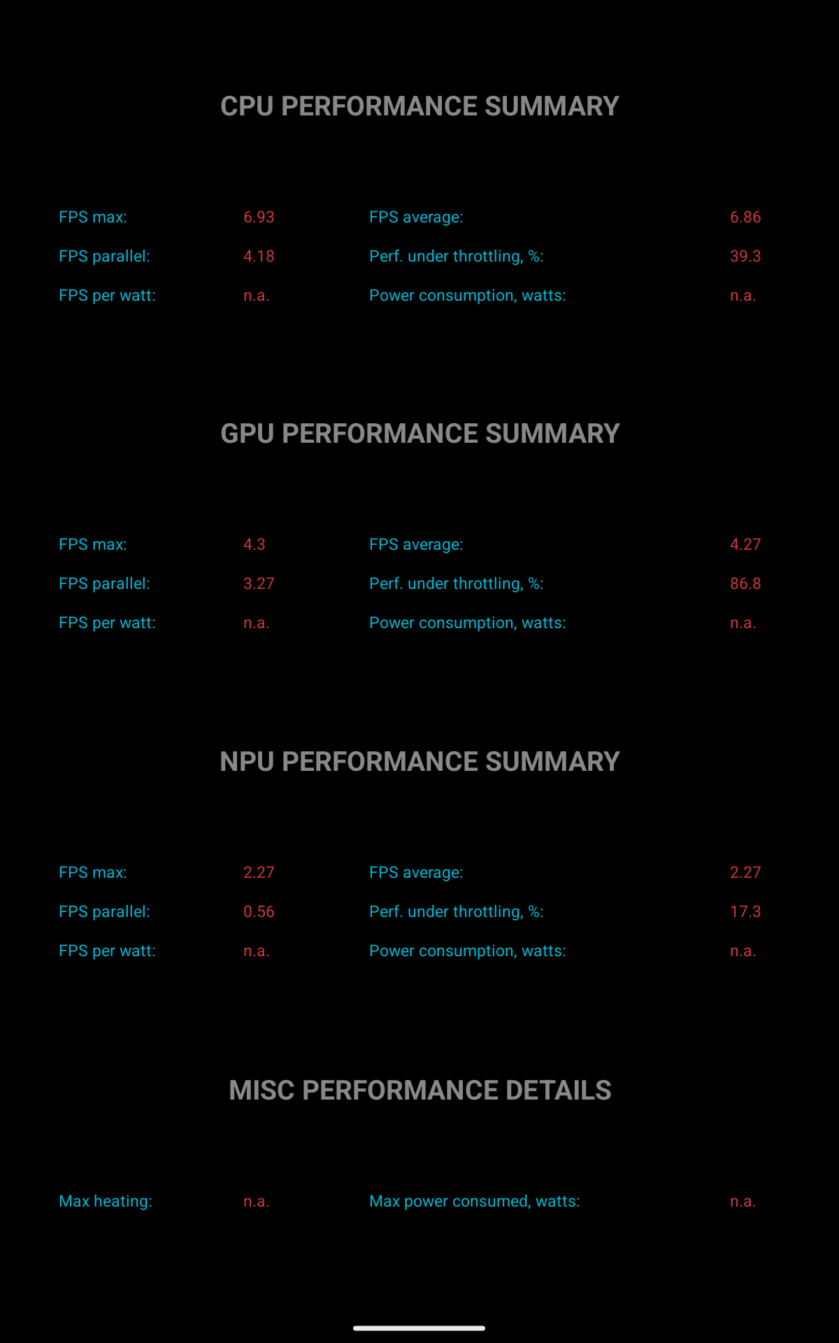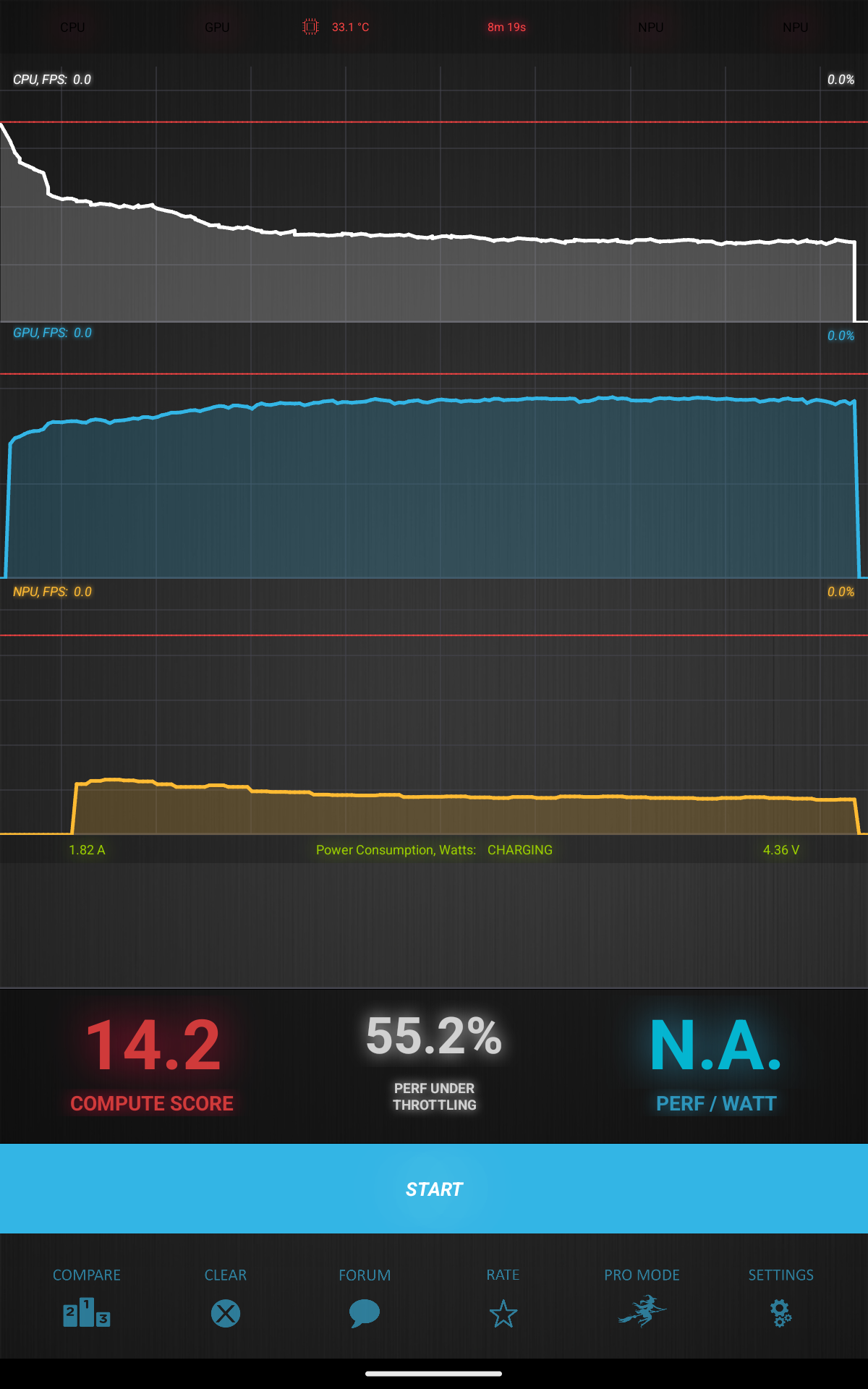 Тест на снижение производительности при нагреве мы проводим с помощью программы Burnout Benchmark, которая позволяет нагружать CPU, GPU и NPU: