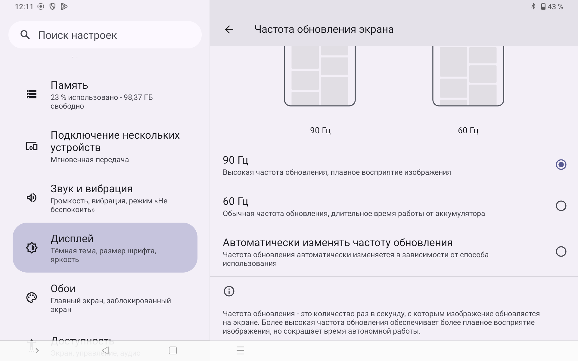 В настройках экрана можно включить режим с повышенной до 90 Гц частотой обновления. В режиме 90 Гц плавность прокрутки списков меню заметно повышается.