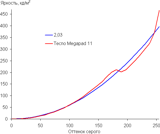 Построенная по 32 точкам с равным интервалом по численному значению оттенка серого гамма-кривая не выявила завала ни в светах, ни в тенях. Показатель аппроксимирующей степенной функции равен 2,03, что ниже стандартного значения 2,2. При этом реальная гамма-кривая заметно отклоняется от степенной зависимости: