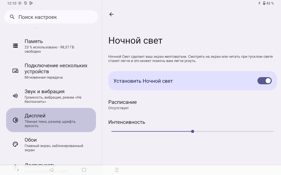 В принципе, яркий свет может приводить к нарушению суточного (циркадного) ритма (см. статью про iPad Pro с дисплеем 9,7 дюйма), но все решается снижением яркости до низкого, но еще комфортного уровня, а искажать цветовой баланс, уменьшая вклад синего, нет абсолютно никакого смысла. К сожалению, эту настройку нельзя использовать для коррекции цветового баланса, так как даже на минимальном уровне коррекции цветовая температура слишком сильно занижается (до примерно 6200 К).