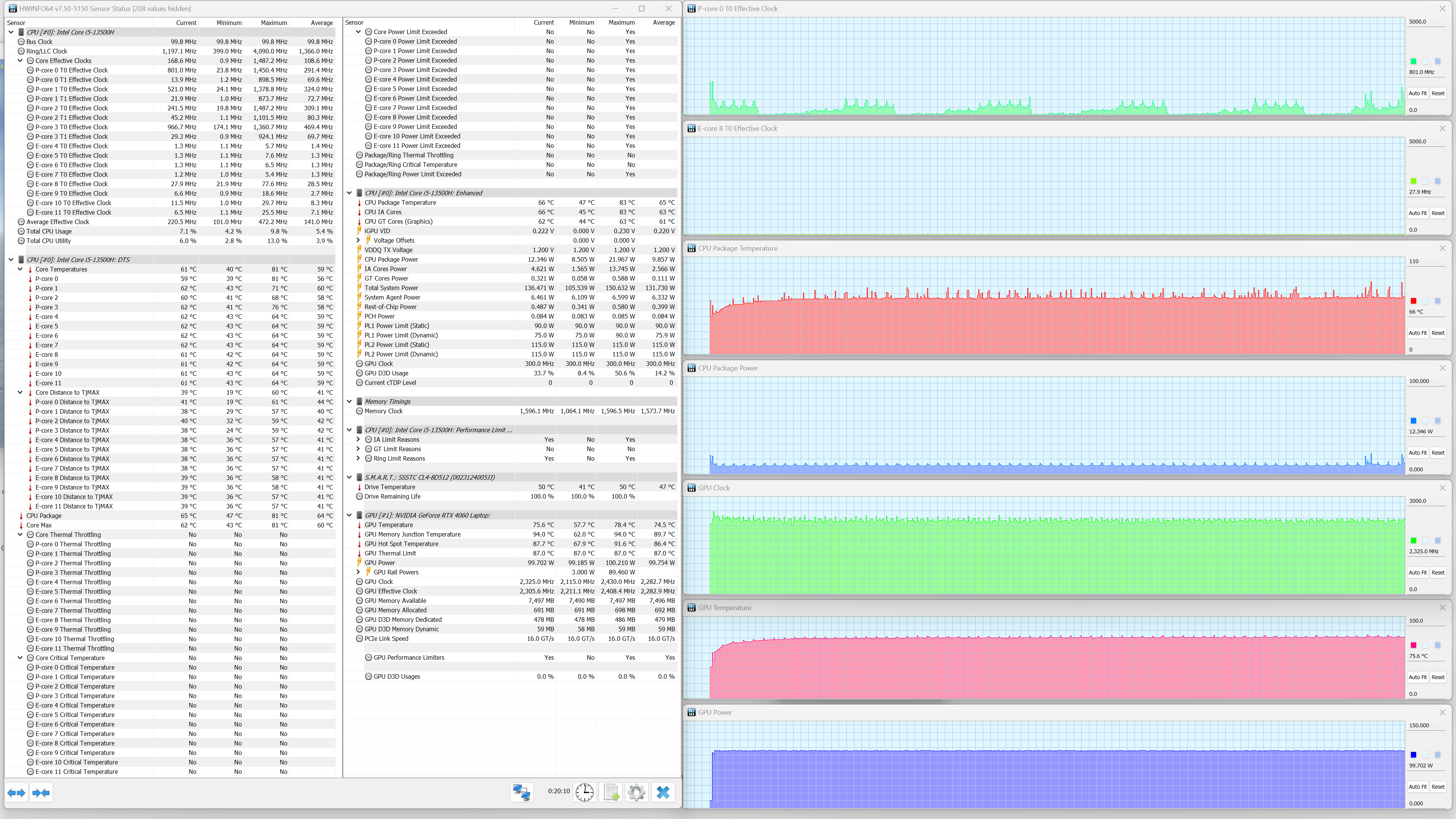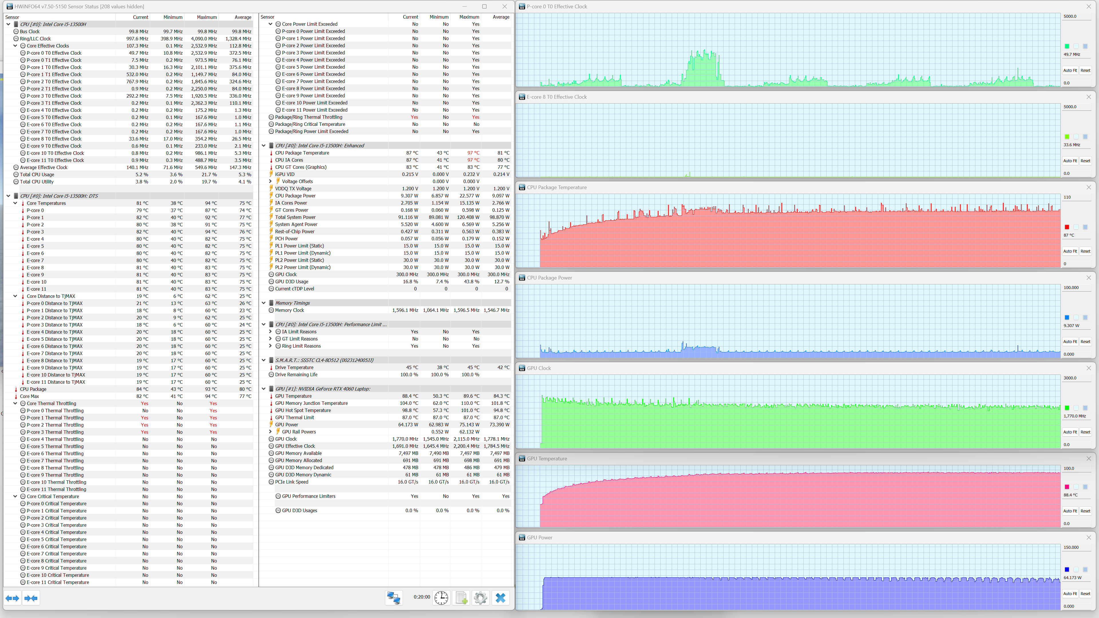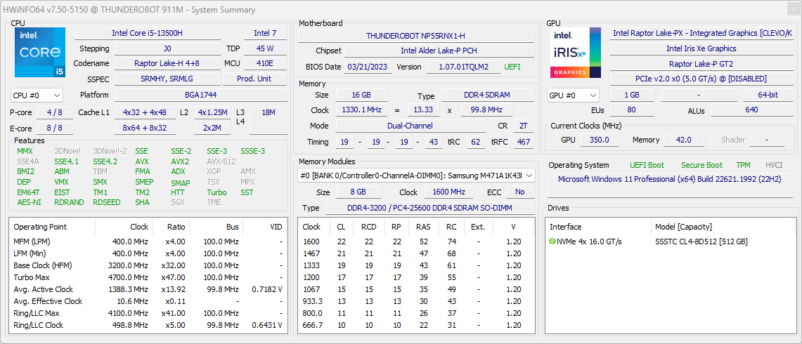 Thunderobot 911 M G3 Pro оснащен мобильным процессором Intel Core i5-13500H (кодовое наименование Raptor Lake-H) среднего уровня производительности. В его распоряжении имеются четыре высокопроизводительных, или P-ядра (Performance cores), работающих в два потока (базовая тактовая частота 2,6 ГГц, в турборежиме — до 4,7 ГГц), и восемь энергоэффективных, или E-ядер (Efficient cores), работающих в однопоточном режиме (базовая тактовая частота 1,9 ГГц, в турборежиме — до 3,5 ГГц). Отбор мощности в соответствии со спецификациями теплопакета составляет от 35 до 45 Вт в стандартном режиме и до 95 Вт при Turbo Boost. В тестировании под нагрузкой мы выявили, что в высокопроизводительных сценариях потребление CPU составляет при разгоне 95 Вт, а в стабильном режиме — 60 Вт. Таким образом предписание TDP превышено. Низкоуровневые параметры главного вычислителя доступны в приложении HWinfo.