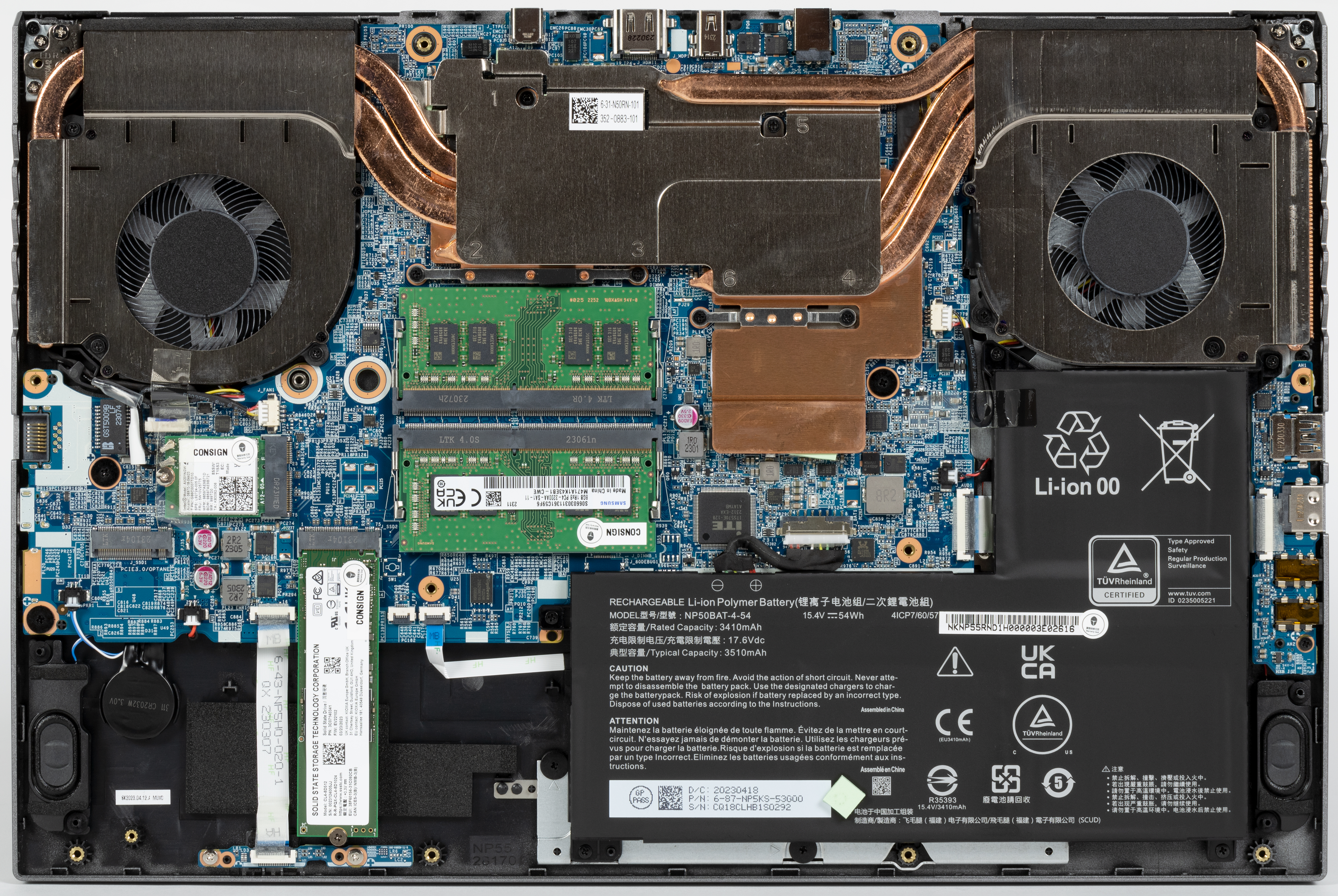 Системная плата разрезная, трехкомпонентная. Она состоит из главного модуля и двух сателлитов: на первом (на фото — справа) располагаются оба порта USB Type-A и аудиоразъемы; на переднем (на фото — внизу) — блок сигнальных индикаторов передней панели. Возможности апгрейда типичны для игровых ноутбуков: можно увеличить доступный объем оперативной памяти (скажем, установить 64 ГБ в двух модулях по 32 ГБ), заменить твердотельный накопитель в первом слоте M.2 или добавить еще один во второй свободный слот. Эти операции производятся очень быстро и традиционно не вызывают затруднений. Чуть больше времени потребует замена батареи. Последняя крепится к корпусу винтами и обладает собственным коннектором, вставленным в ответный разъем на системной плате, поэтому для замены не потребуются ни паяльник, ни специальный инструмент.