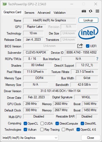У главного вычислителя имеется интегрированное графическое ядро Intel Iris Xe Graphics (Raptor Lake, 80 EU), но для игр и приложений, умеющих задействовать GPU, установлена дискретная видеокарта, причем, новейшего поколения Nvidia GeForce RTX 4060 Laptop. Она, правда, не самая выдающаяся в иерархическом древе GPU Nvidia, но безусловно поддерживает трассировку лучей (маркировка RTX) и может составить конкуренцию даже более продвинутым моделям ноутбучных видеокарт прежней генерации. Низкоуровневые параметры видеоускорителя представлены на скриншоте приложения GPU-Z.