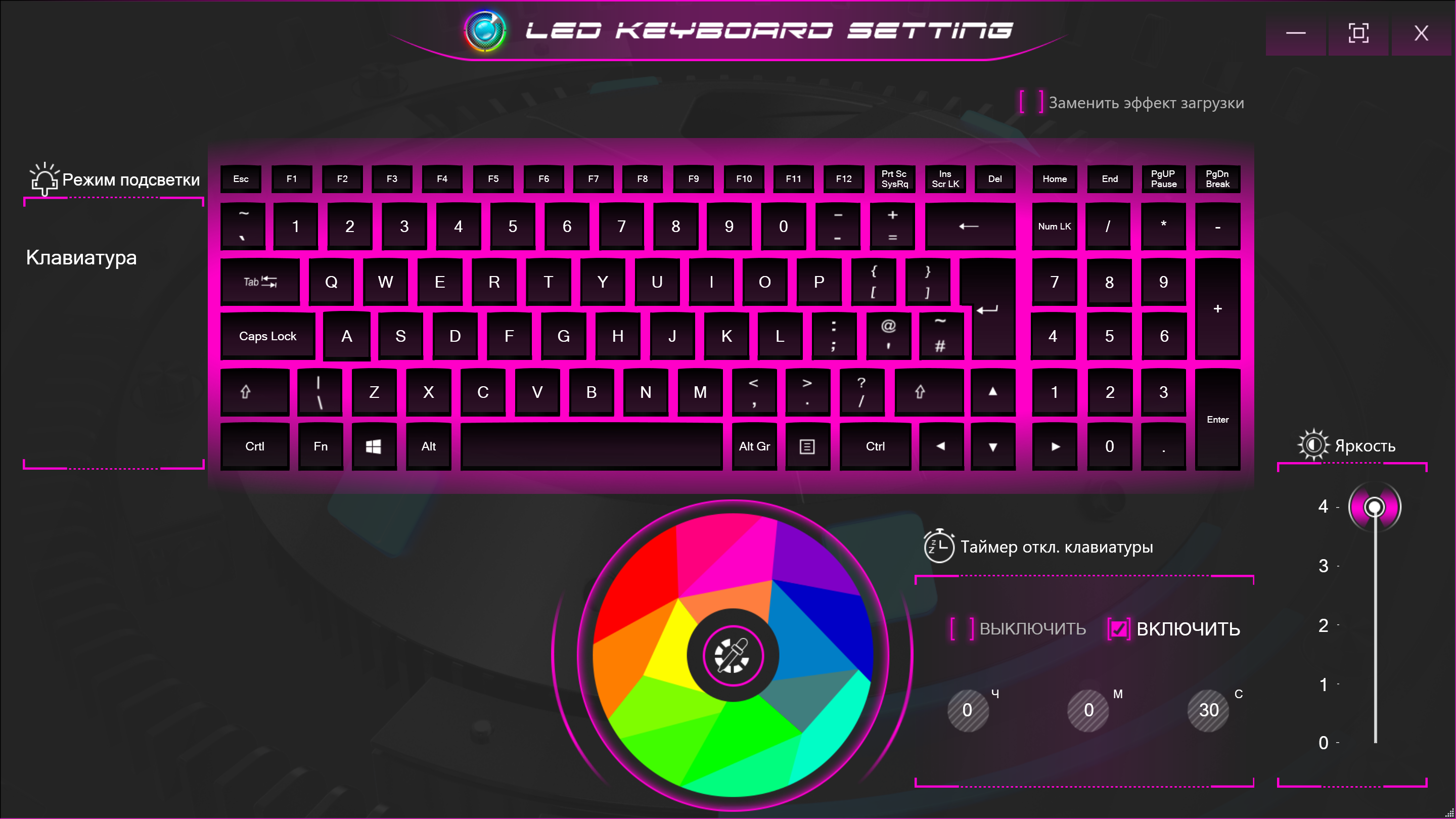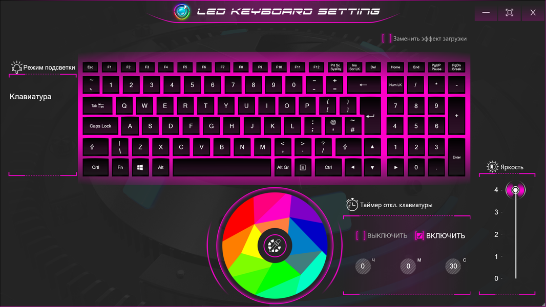 LED Keyboard Setting дает возможность выбирать цвет подсветки клавиатуры, устанавливать таймаут отключения при бездействии, а также задавать яркость. Подсветка только статическая, одноцветная, без переливов.