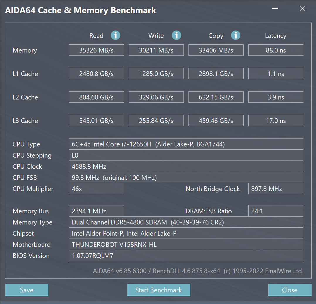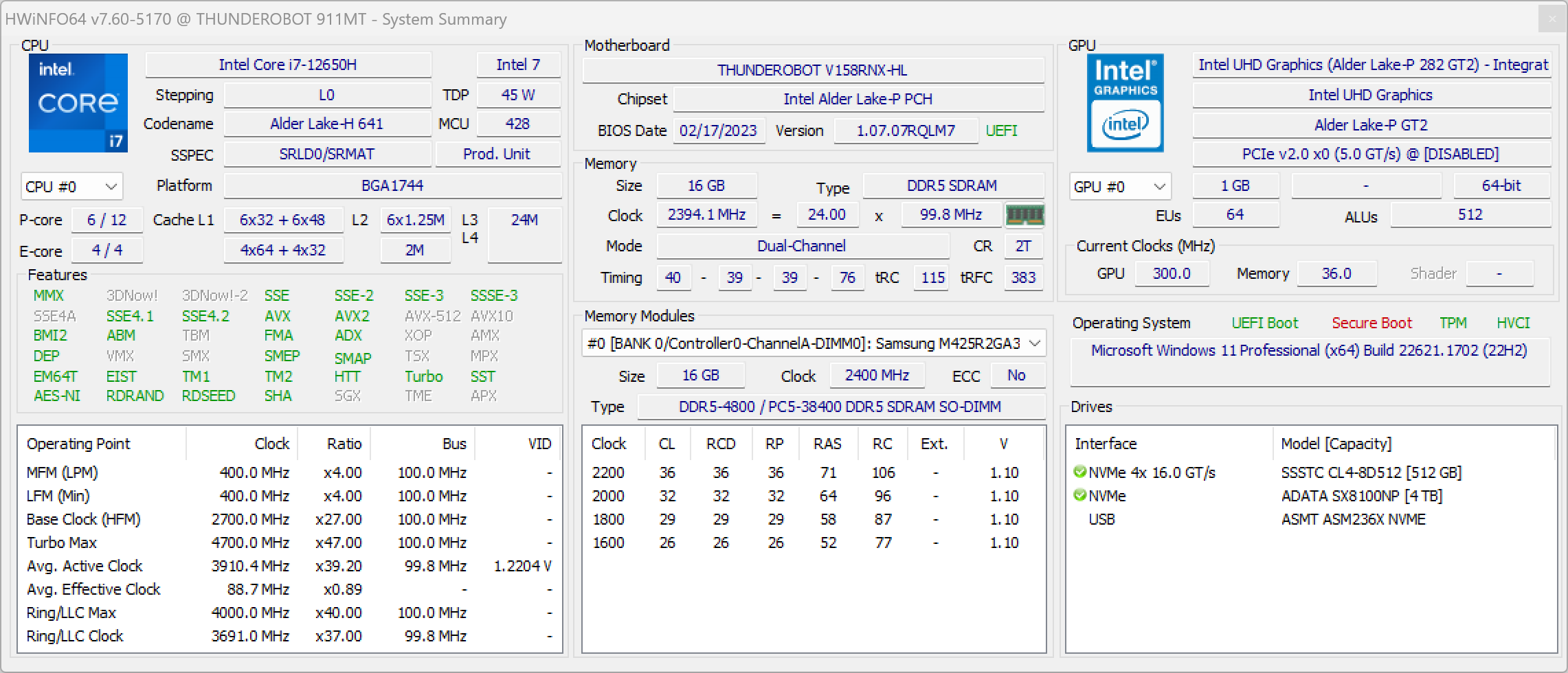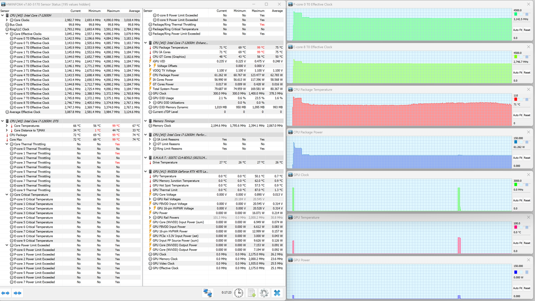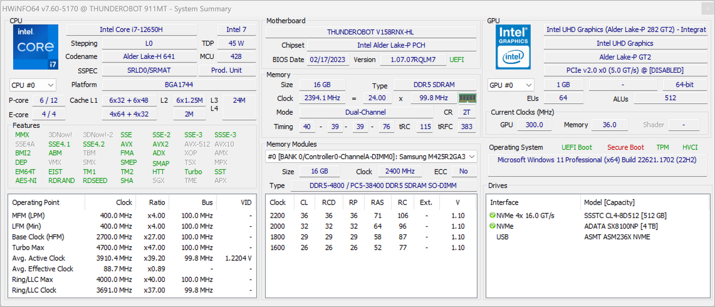 Thunderobot 911 Plus G2 Max оснащен мобильным процессором Intel Core i7-12650H не самого высокого уровня производительности. В нем имеются шесть высокопроизводительных, или P-ядер (Performance cores), работающих в два потока (до 4,7 ГГц в турборежиме), и четыре энергоэффективных, или E-ядра (Efficient cores), работающих в однопоточном режиме (до 3,4 ГГц в турборежиме). Отбор мощности в соответствии со штатным теплопакетом должен составлять 35—45 Вт при стабильной работе и до 115 Вт при Turbo Boost. Однако в тестировании под нагрузкой мы выявили, что в высокопроизводительных сценариях потребление CPU составляет при разгоне 123 Вт, а в стабильном режиме — 63 Вт. Низкоуровневые параметры главного вычислителя доступны в приложении HWinfo.