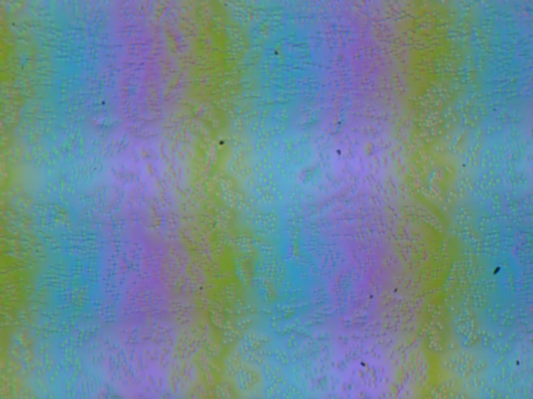 Зерно этих дефектов в несколько раз меньше размеров субпикселей (масштаб этих двух фотографий примерно одинаковый), поэтому фокусировка на микродефектах и «перескок» фокуса по субпикселям при изменении угла зрения выражены слабо, из-за этого нет и «кристаллического» эффекта.