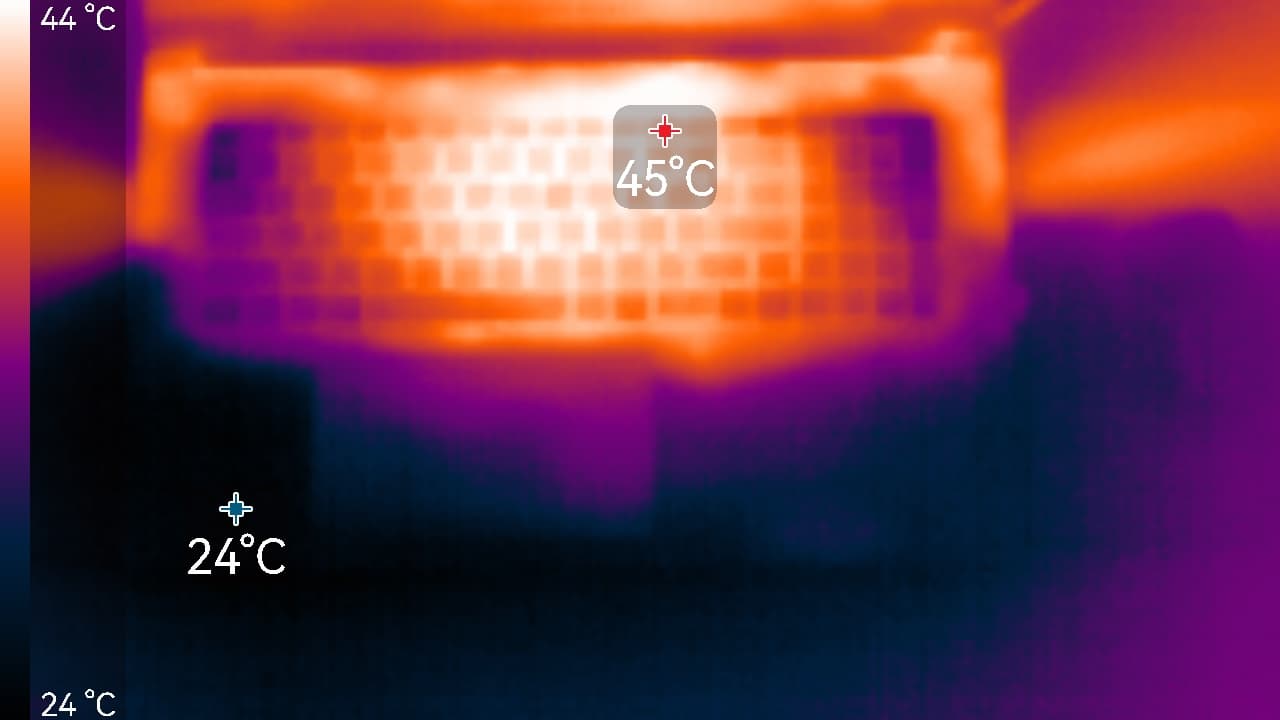 Внешняя поверхность матрицы черная жесткая и полуматовая (зеркальность хорошо выражена). Какие-либо специальные антибликовые покрытия или фильтр отсутствуют, нет и воздушного промежутка. При питании от сети или от батареи и при ручном управлении яркостью (автоматической подстройки по датчику освещенности нет) ее максимальное значение составило 282 кд/м² (в центре экрана на белом фоне). Максимальная яркость не очень высокая. Впрочем, если избегать прямого солнечного света, то даже такое значение позволяет как-то использовать ноутбук на улице даже летним солнечным днем.
