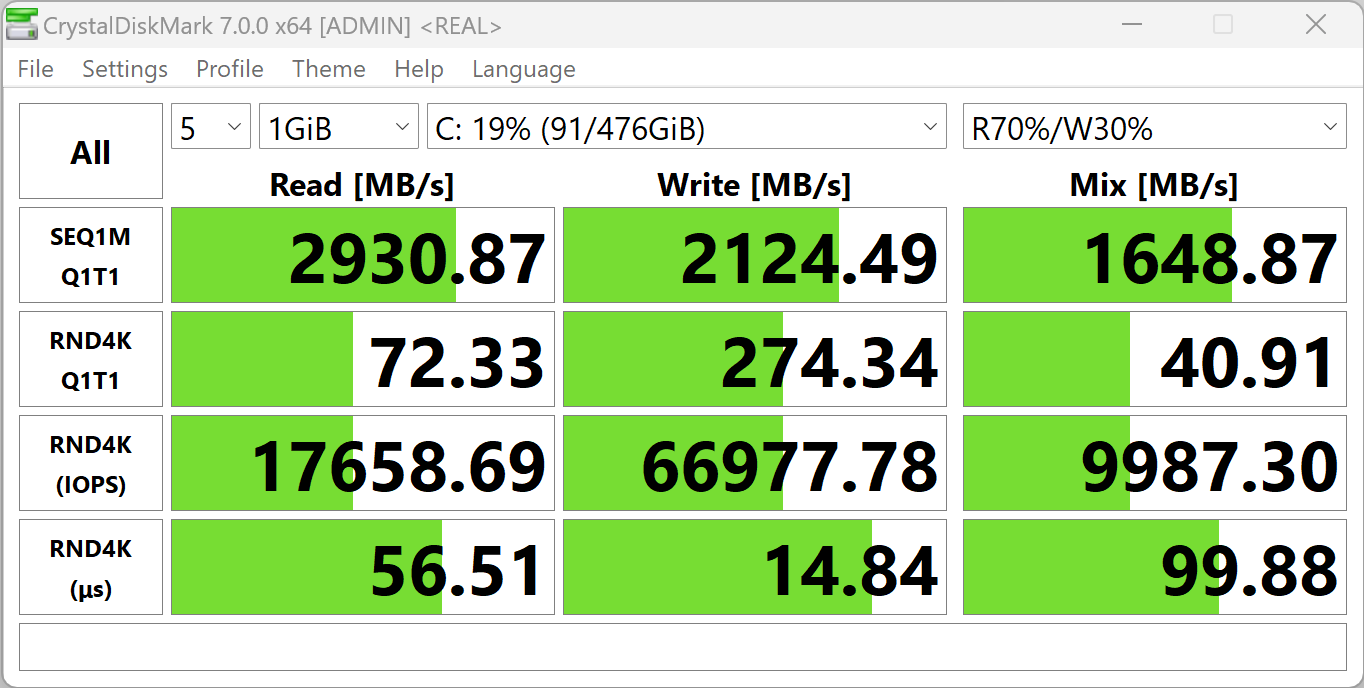 В роли системного хранилища программ и данных выступает твердотельный NVMe-накопитель SSSTC CL4-8D512 с интерфейсом подключения PCIe 4.0 ×4. Он производится на заводах китайской компании Solid State Storage Technology, ныне принадлежащей японской корпорации Kioxia. Неформатированная емкость хранилища составляет 512 ГБ. После развертывания Windows 11 и стандартного набора приложений в распоряжении пользователя остается менее 440 ГБ. Посмотрим на результаты тестирования скорости работы накопителя средствами популярной утилиты CrystalDiskMark.