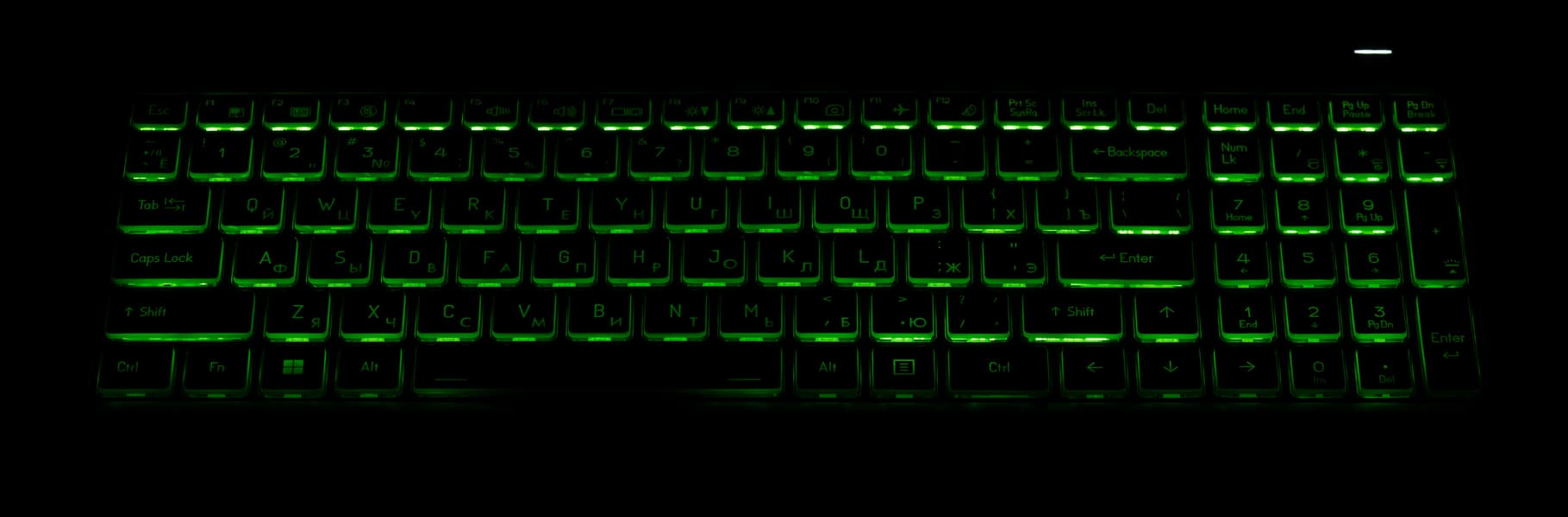 Подсвечиваются сами символы на клавишах и существенно сильнее — их контуры. Зона подсветки под каждой клавишей видна весьма назойливо, что несколько раздражает. Распределение света и специфика маркировки национальной клавиатуры ухудшают различимость символов.