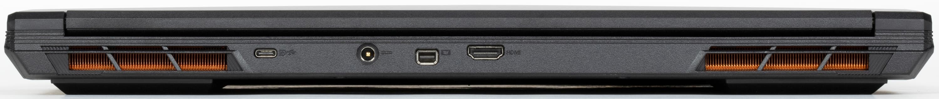Справа и слева на задней панели видны решетки двух выпускных трактов системы охлаждения, через которые наружу выбрасывается нагретый воздух. Между ними слева направо расположены порт USB Type-C, коаксиальный разъем для подключения адаптера питания, видеовыходы Mini-DisplayPort и HDMI.