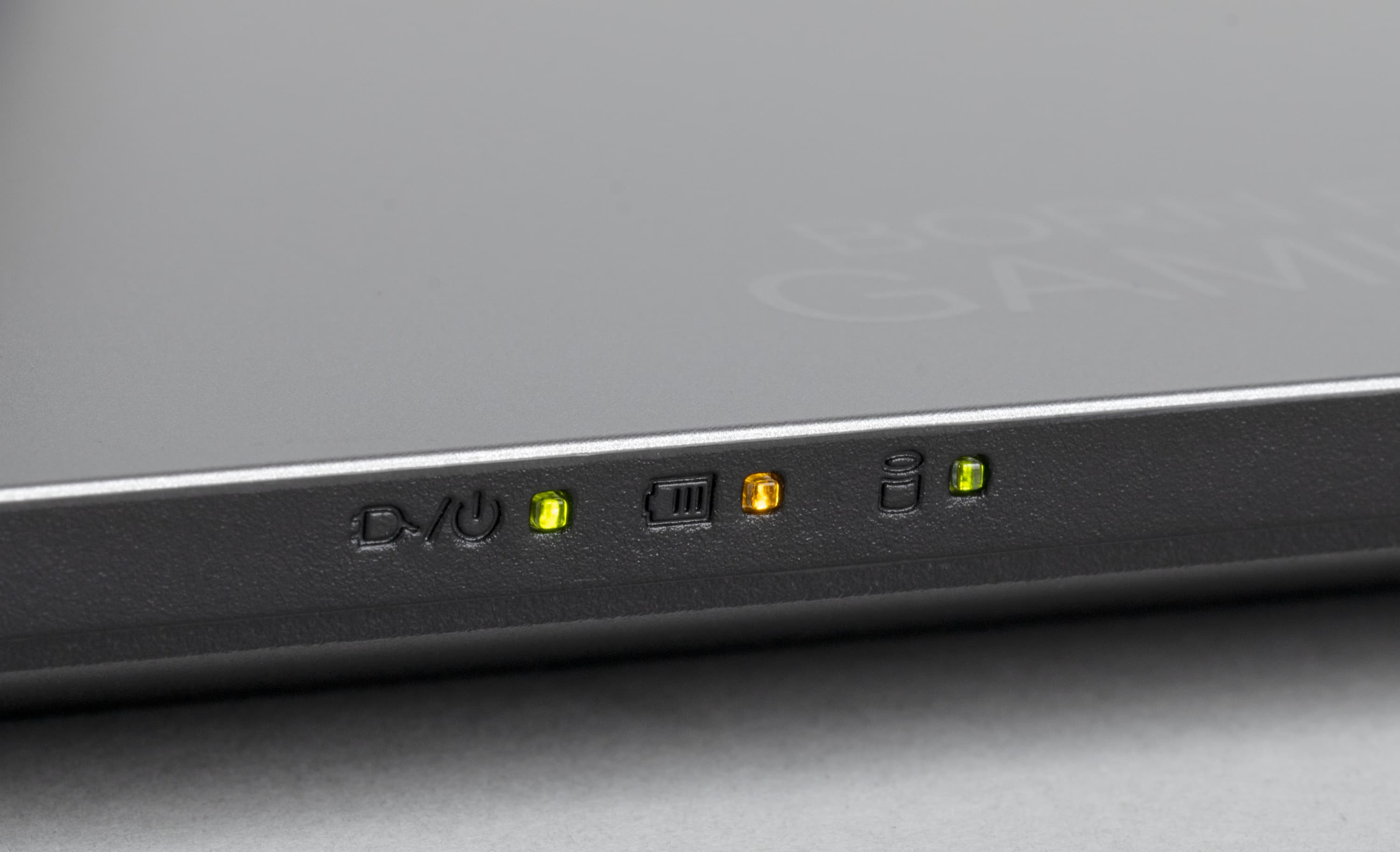 Левый светодиод группы уведомляет о подключении внешнего питания, средний указывает на состояние аккумулятора, а правый сигнализирует об активности системного накопителя.