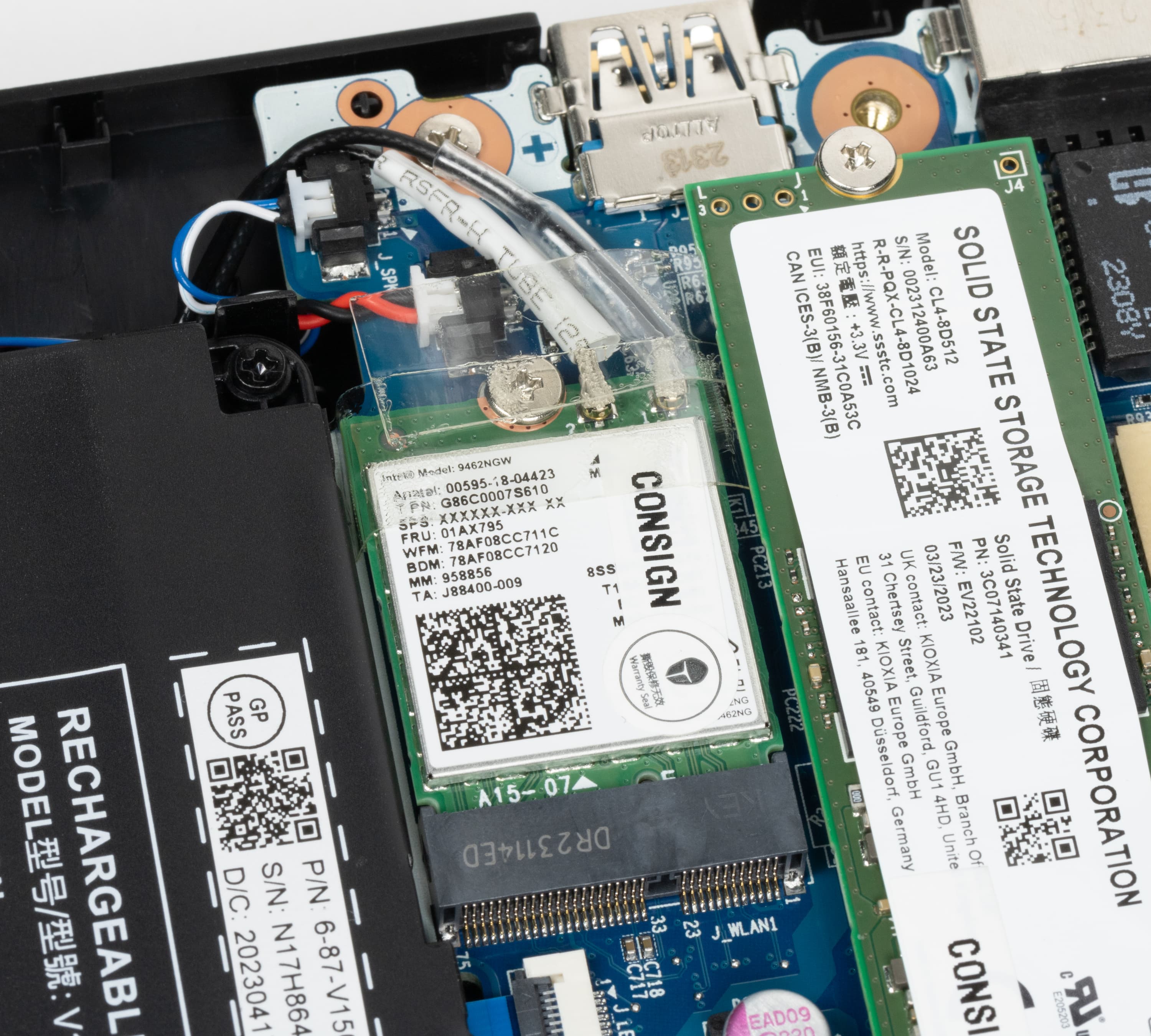 Подключение к беспроводным сетям обеспечивает двухдиапазонный (2,4/5 ГГц) адаптер Intel 9462NGW издания 2017 года (кодовое наименование Jefferson Peak), соответствующий классу Wi-Fi 5 и поддерживающий стандарты IEEE 802.11aс и Bluetooth 5.1. По счастью, этот компонент оснастки не распаян на плате, а установлен в слоте M.2, поэтому его можно без особого труда заменить на более современный высокоскоростной адаптер с поддержкой Wi-Fi 6E и Bluetooth 5.3.