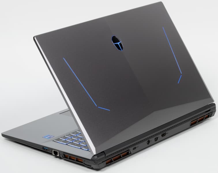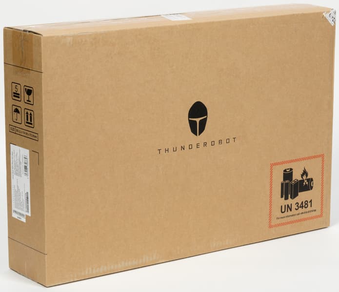Снаружи на ней выделяется рельефный логотип серии игровых ноутбуков Thunderobot и четыре узких полоски. Эти элементы подсвечиваются синим при включении питания. Модель обладает крупным экраном 17,3 дюйма по диагонали, поэтому обладает значительными размерами и весит почти 2,8 кг.