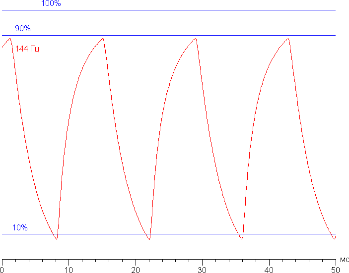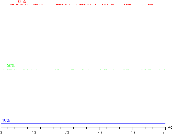 На любом уровне яркости значимая модуляция подсветки отсутствует, поэтому нет и никакого мерцания экрана. В доказательство приведем графики зависимости яркости (вертикальная ось) от времени (горизонтальная ось) при различных значениях настройки яркости: