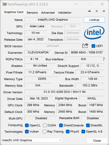 У главного вычислителя имеется интегрированное графическое ядро Intel UHD Graphics (Raptor Lake, 64 EU), но для игр и приложений, умеющих задействовать GPU, установлена дискретная видеокарта, причем новейшего поколения — Nvidia GeForce RTX 4070 Laptop. Она может составить конкуренцию даже более продвинутым моделям ноутбучных видеокарт прежнего семейства GeForce RTX 30. Низкоуровневые параметры видеоускорителя представлены на скриншоте приложения GPU-Z.