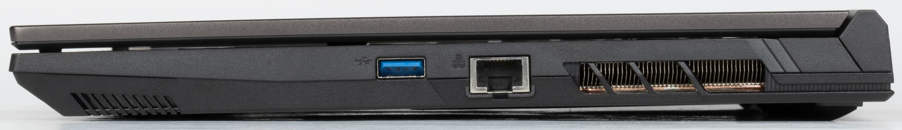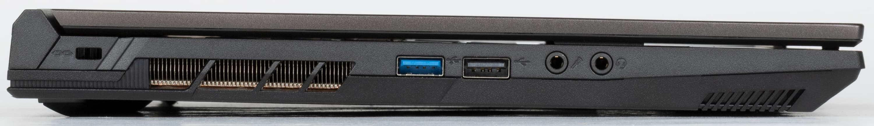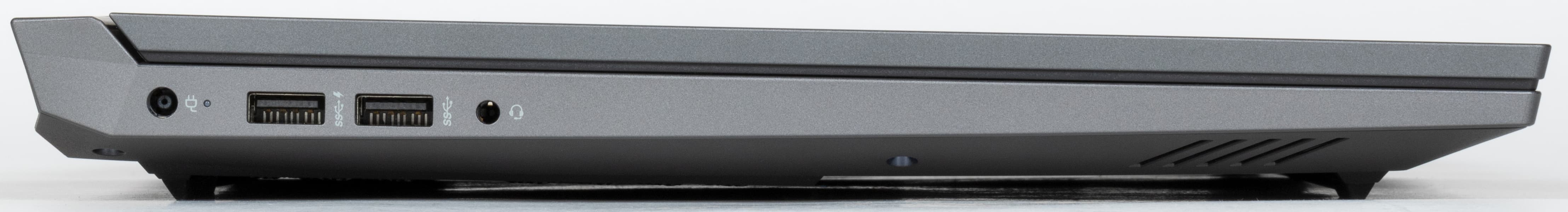 На левой боковой панели Thunderobot 911 X Wild Hunter G3 XD первым слева располагается разъем для адаптера питания (который у соперника обращен назад). Направо от него имеются два порта USB 3.2 Gen 1 Type-A, маркированные пиктограммами SuperSpeed. Первый (левый) также помечен «молнией» — это свидетельствует о поддержке не Thunderbolt (для разъемов Type-A ее не существует), а PowerDelivery. Последняя деталь (справа) — комбинированный миниджек 3,5 мм для подключения аудиогарнитуры.