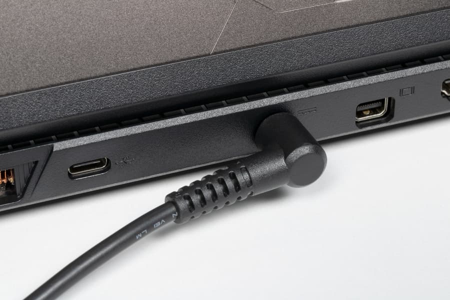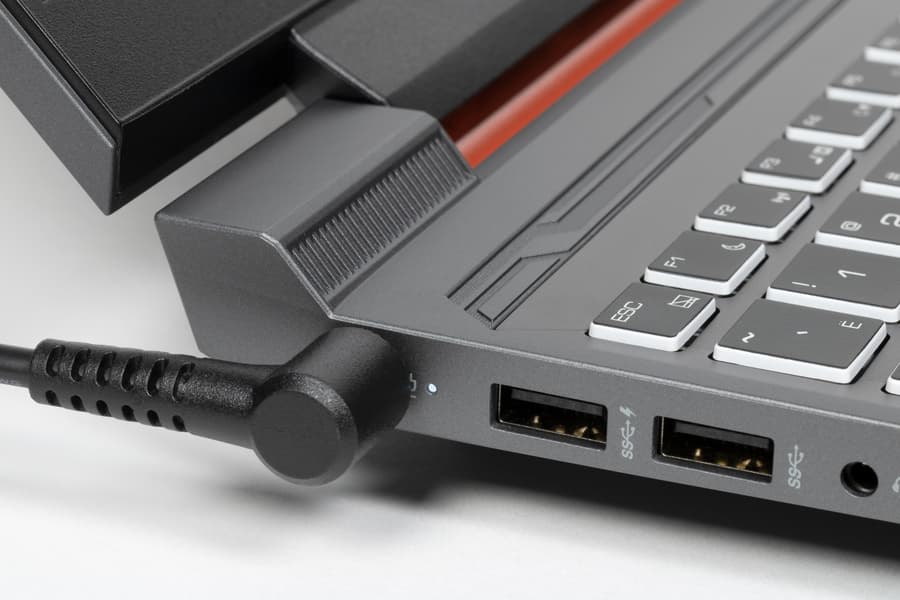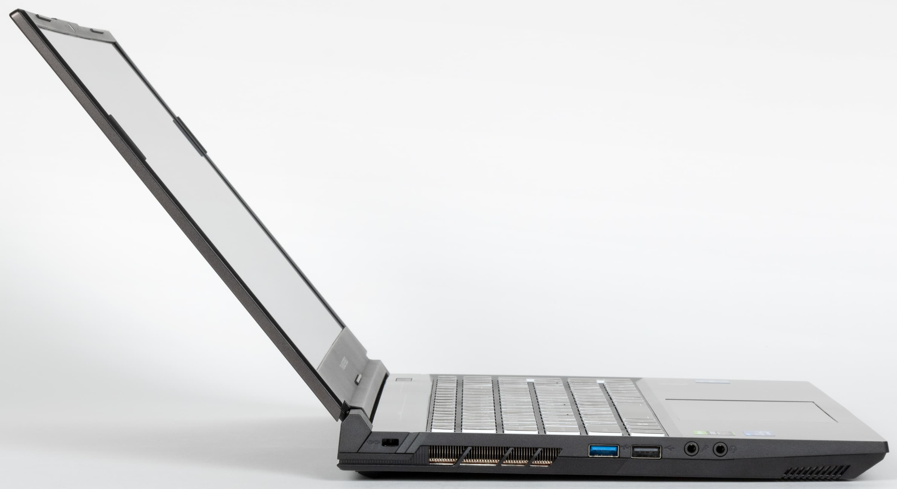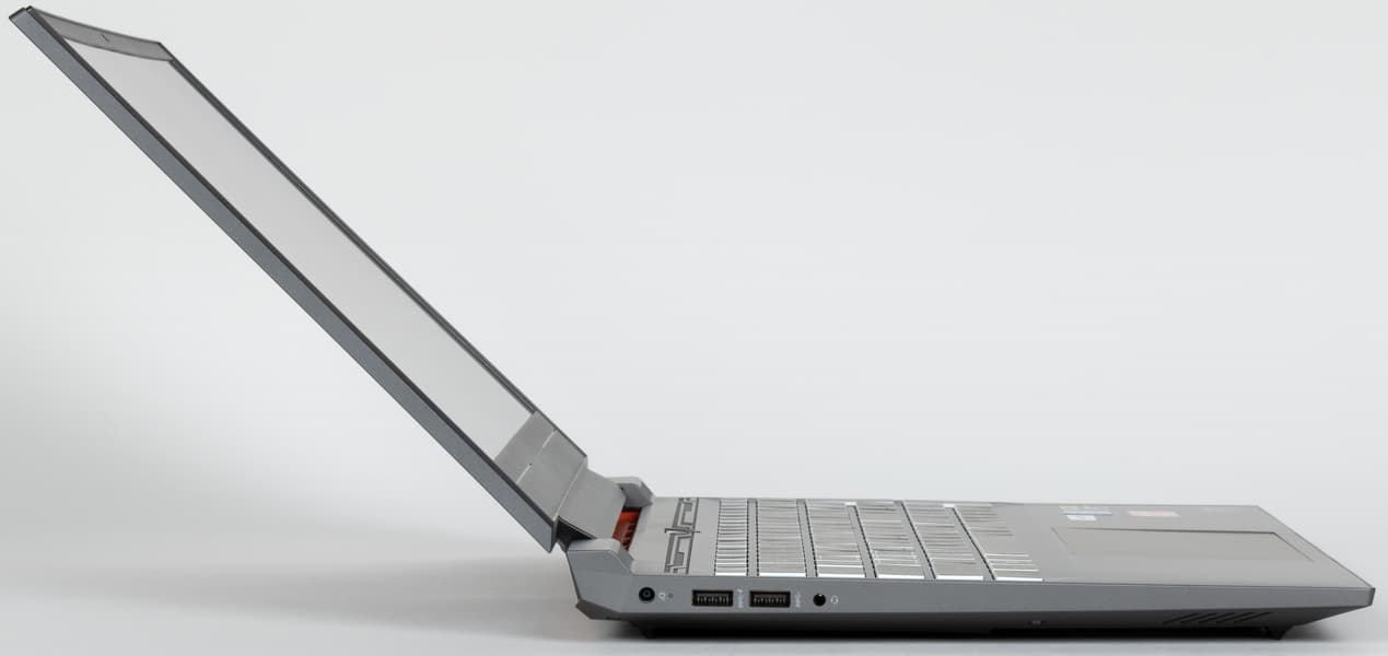 На левой боковой панели Thunderobot 911 X Wild Hunter G3 XD первым слева располагается разъем для адаптера питания (который у соперника обращен назад). Направо от него имеются два порта USB 3.2 Gen 1 Type-A, маркированные пиктограммами SuperSpeed. Первый (левый) также помечен «молнией» — это свидетельствует о поддержке не Thunderbolt (для разъемов Type-A ее не существует), а PowerDelivery. Последняя деталь (справа) — комбинированный миниджек 3,5 мм для подключения аудиогарнитуры.