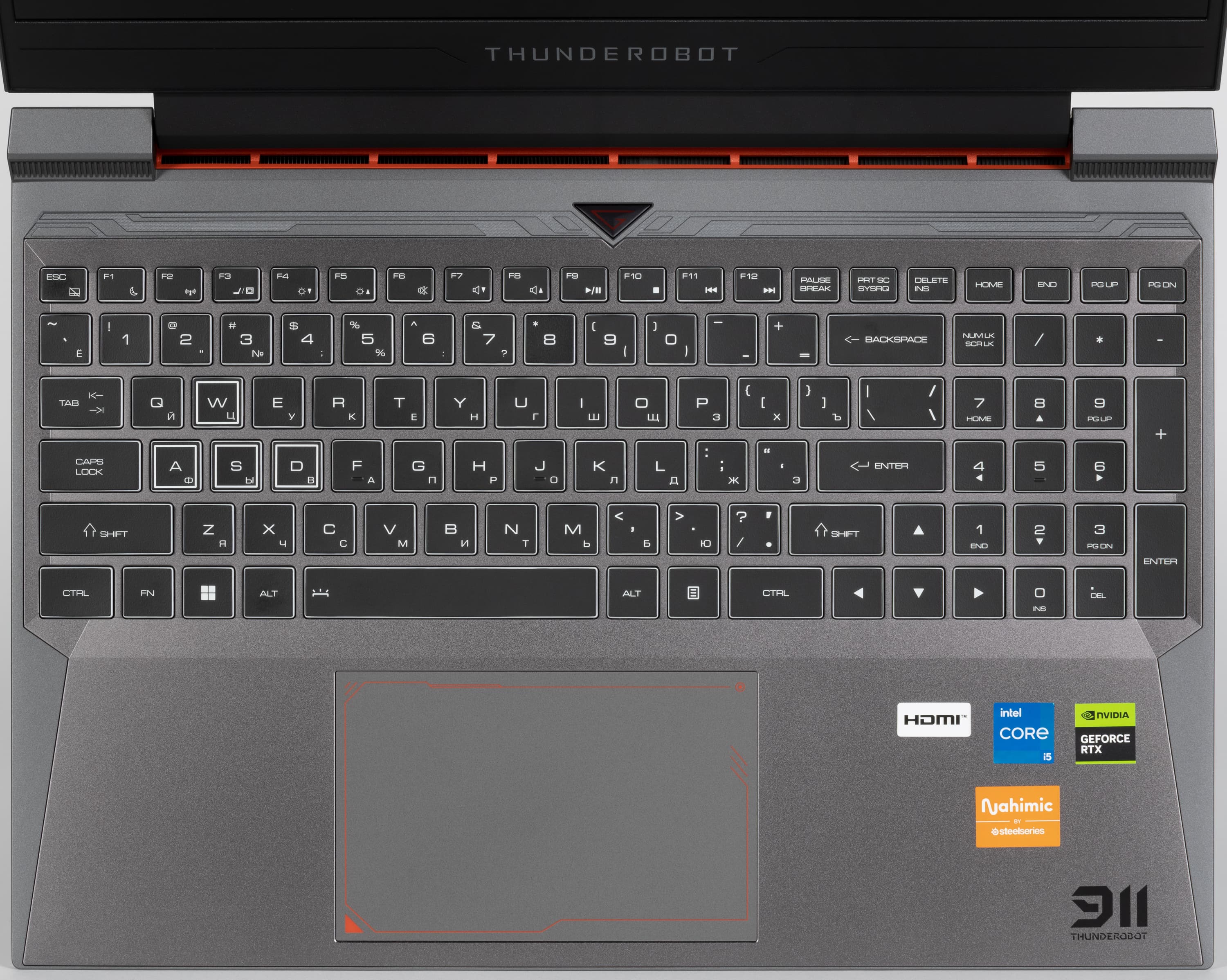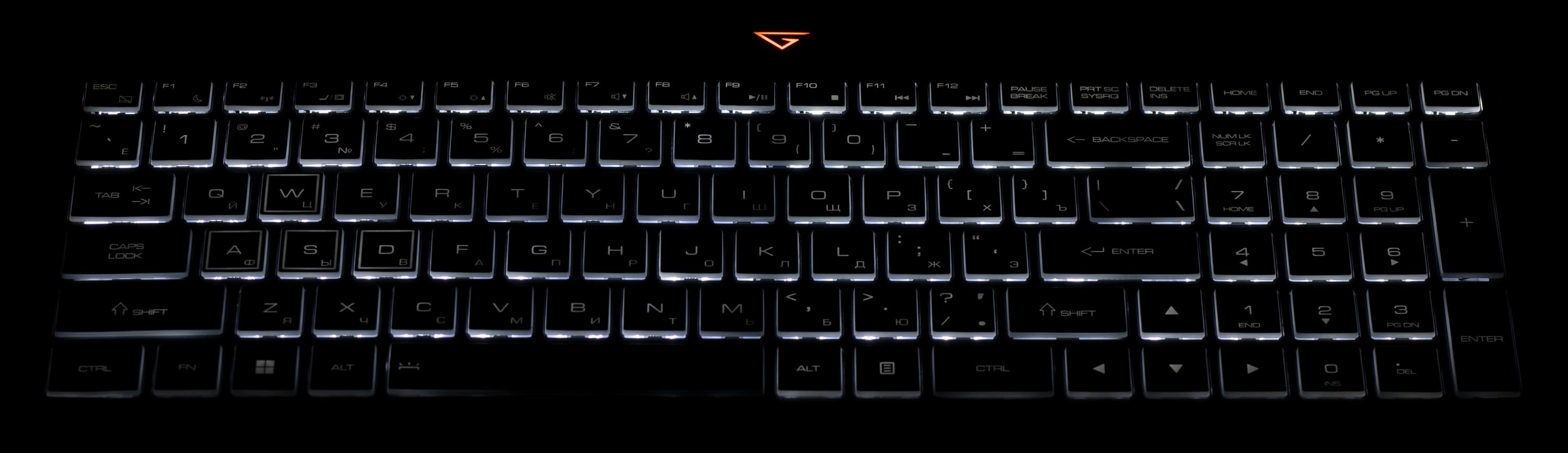 Алфавитно-цифровые и символьные клавиши достаточно крупные (15×15 мм), расстояние между их центрами составляет 17 мм, а между краями — 2 мм. У Thunderobot 911 X Wild Hunter G3 XD утолщенными белыми рамками выделены традиционные «игровые» навигационные клавиши W, A, S, D.