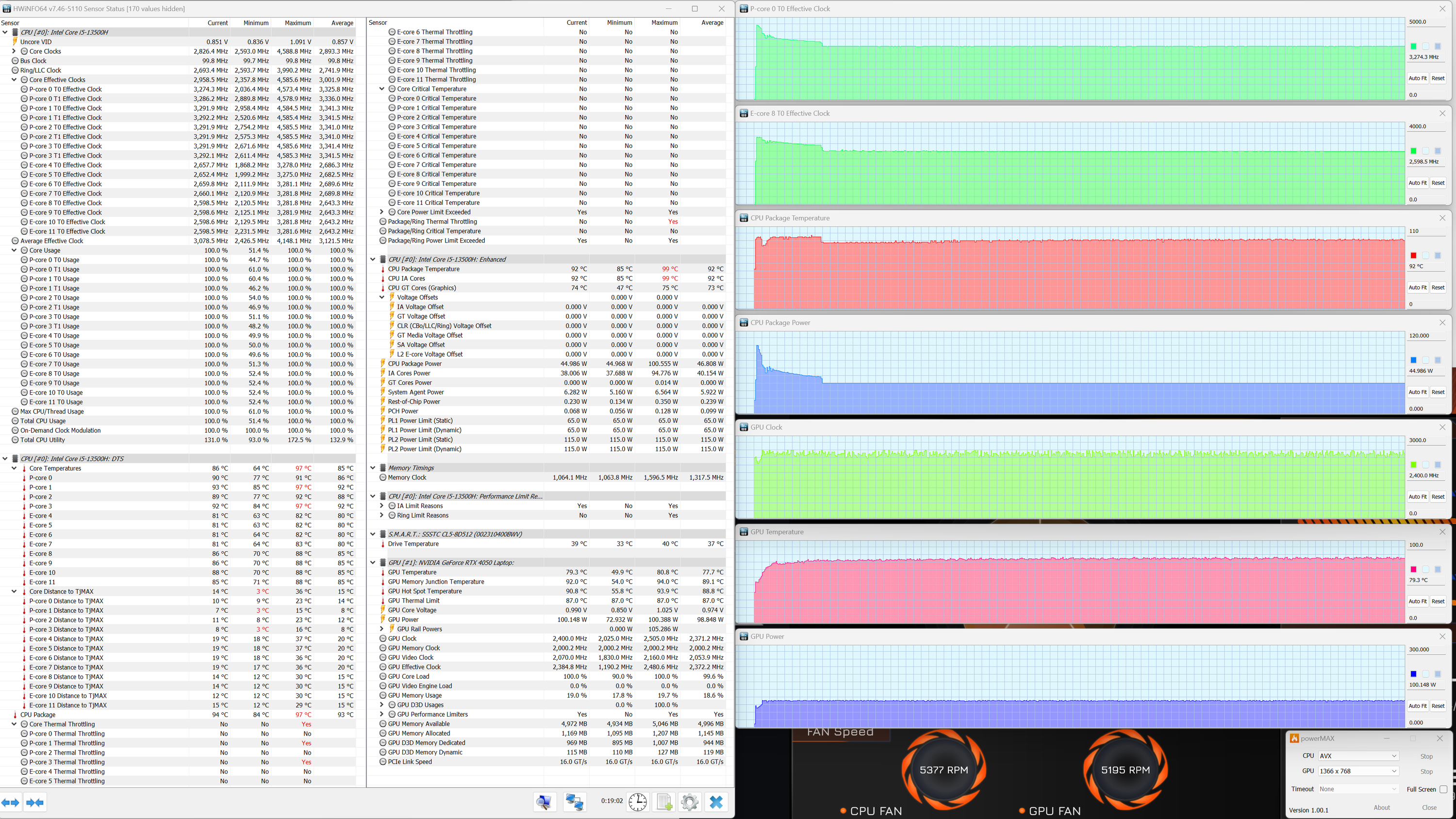 Thunderobot 911 X Wild Hunter G3 XD оснащен центральным процессором Intel Core i5-13500H и видеокартой Nvidia GeForce RTX 4050 Laptop, а Thunderobot 911 MT Pro D построен на Intel Core i5-12450H и Nvidia GeForce RTX 3060 Laptop. Система охлаждения первого ноутбука реализует новую схему «2:1»: два кулера в едином блоке с одним общим радиатором для CPU и GPU. По нашим данным, она адекватна потребностям установленных CPU и видеокарты. Thunderobot 911 MT Pro D использует СО классической схемы «2:4»: два кулера + четыре радиатора. Мы выяснили, что ей не удается стабилизировать работу системы при максимальном отборе мощности CPU без перегрева и тротлинга.