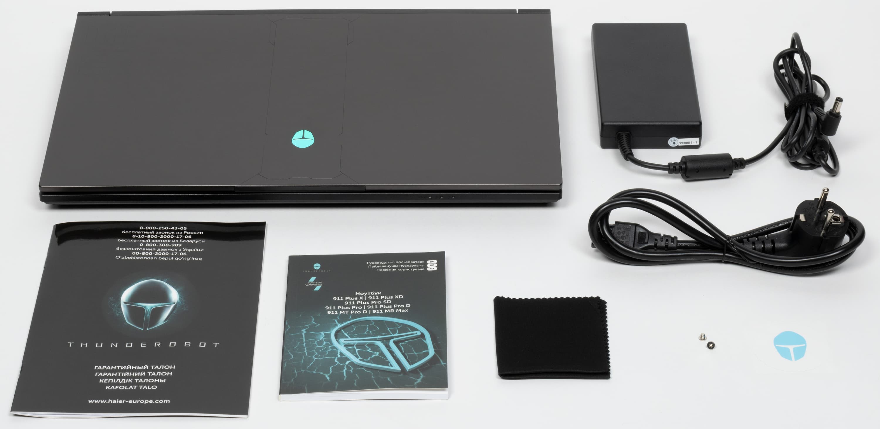 К Thunderobot 911 MT Pro D приложена еще и салфетка из микрофибры (очевидно, для протирки поверхности экрана). Адаптеры питания идентичны вплоть до номера модели (на фото размеры отличаются из-за неодинаковых ракурсов съемки). Оба обеспечивают на выходе 20 В при силе тока 9 А (мощность 180 Вт).
