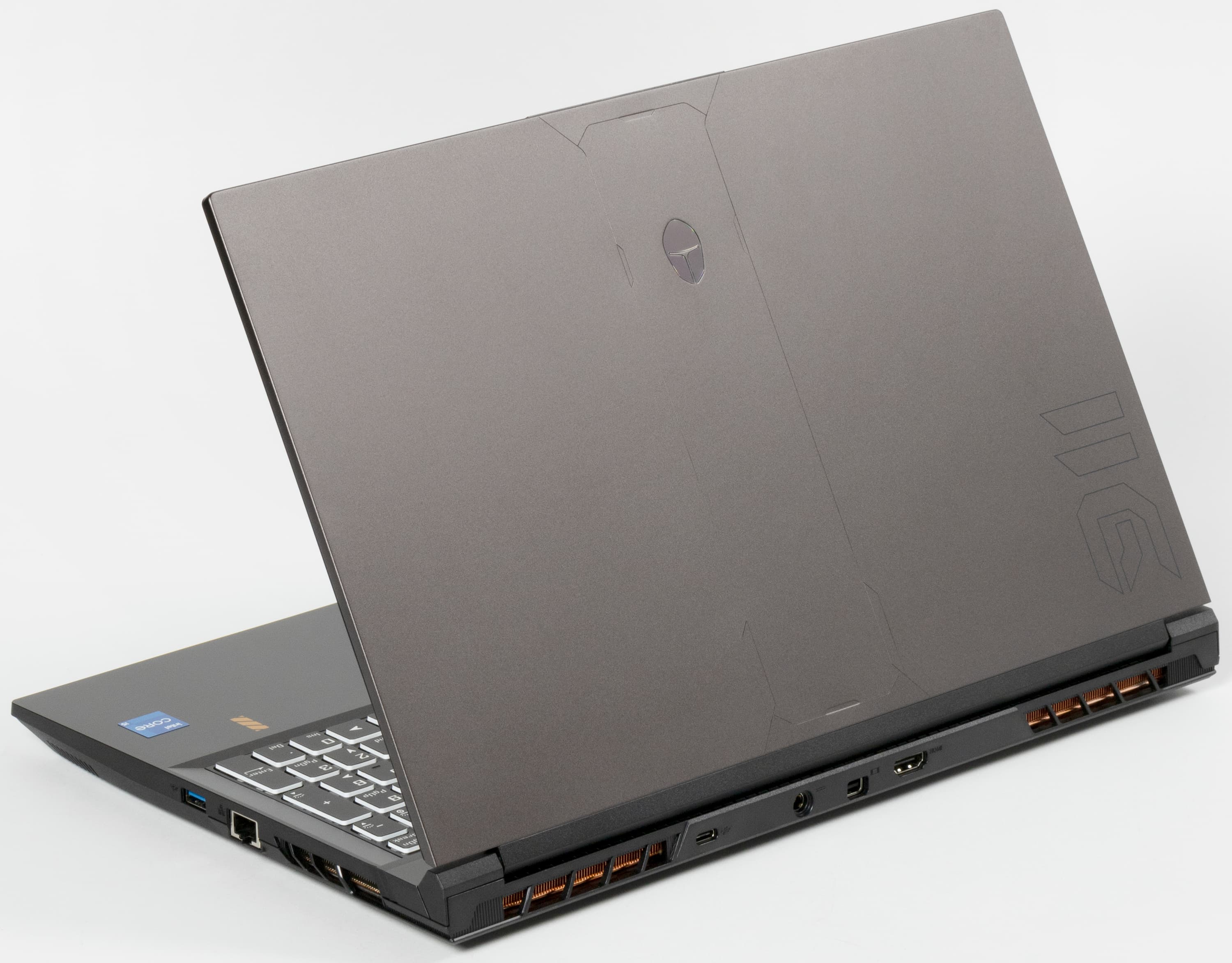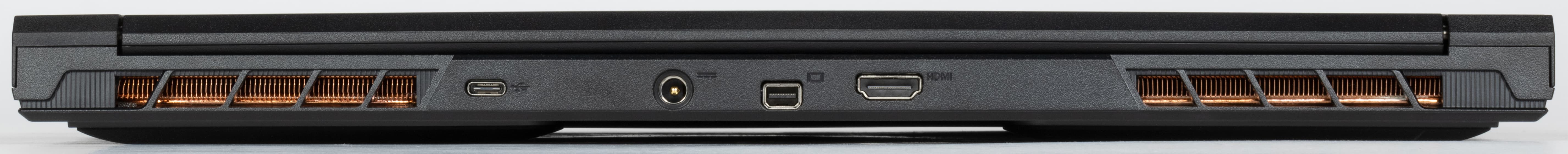 Между двумя задними решетками для эвакуации нагретого воздуха из внутреннего объема машины у Thunderobot 911 MT Pro D помещаются (слева направо) порт USB Type-C, коаксиальный разъем для подключения адаптера питания и два видеовыхода — Mini-DisplayPort и HDMI.