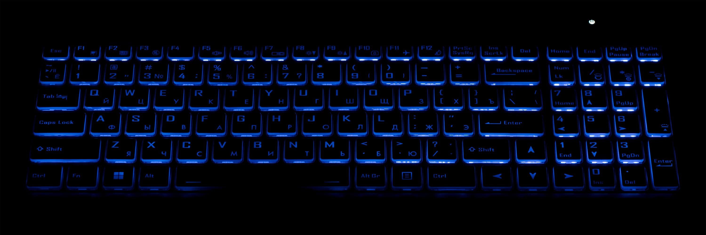 У обоих соперников подсвечиваются и маркирующие символы, и контуры самих клавиш, причем, последние значительно сильнее. Распределение света позволяет различить символы кириллицы, но они видны не так хорошо, как латинские.
