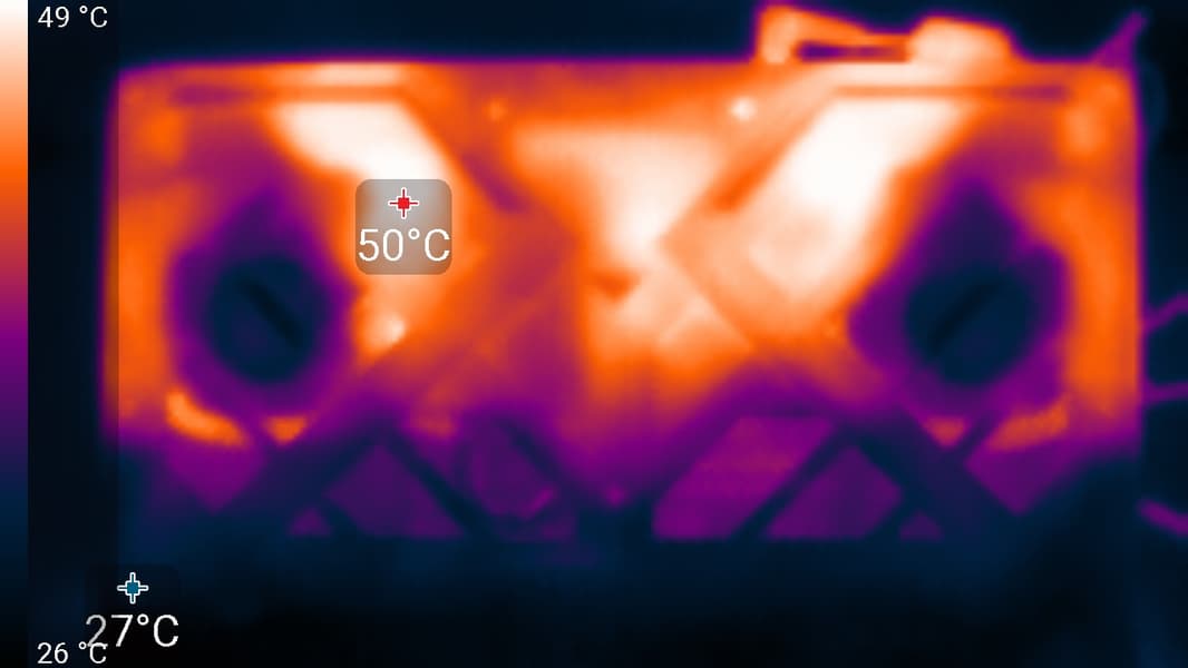 Справа и слева на заднем торце корпуса, а также на боковых кромках имеются решетки, через которые система вентиляции выбрасывает нагретый воздух. Подогрева нижней части экрана при этом не происходит, поскольку он выдвинут чуть вперед относительно заднего края корпуса.
