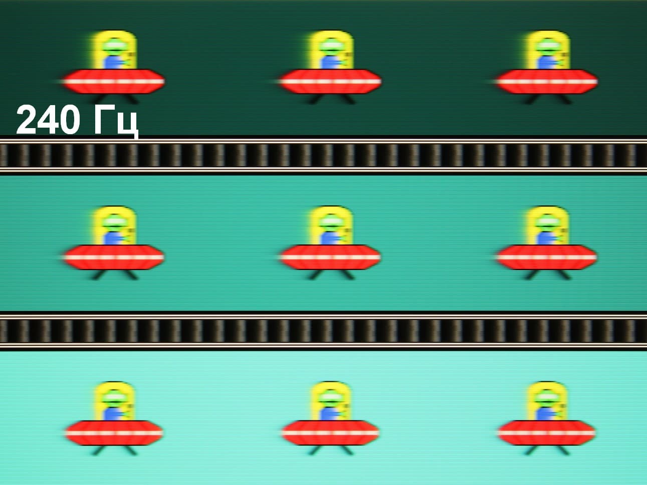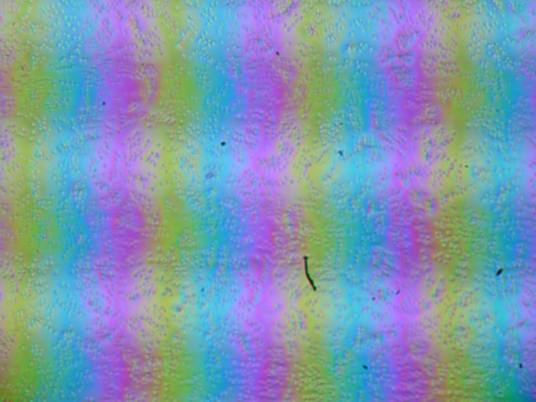 Зерно этих дефектов в несколько раз меньше размеров субпикселей (масштаб этих двух фотографий примерно одинаковый), поэтому фокусировка на микродефектах и «перескок» фокуса по субпикселям при изменении угла зрения выражены слабо, из-за этого нет и «кристаллического» эффекта.