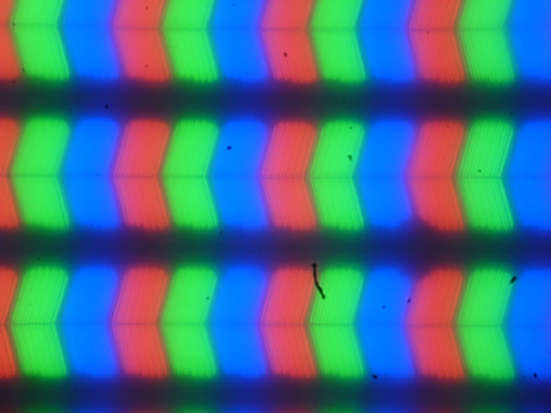 В этом ноутбуке используется матрица типа IPS. Микрофотографии демонстрируют типичную для IPS структуру субпикселей (черные точки — это пыль на матрице фотоаппарата):