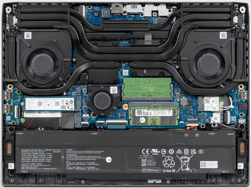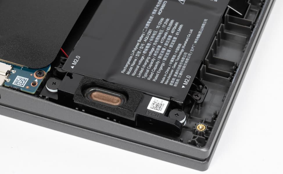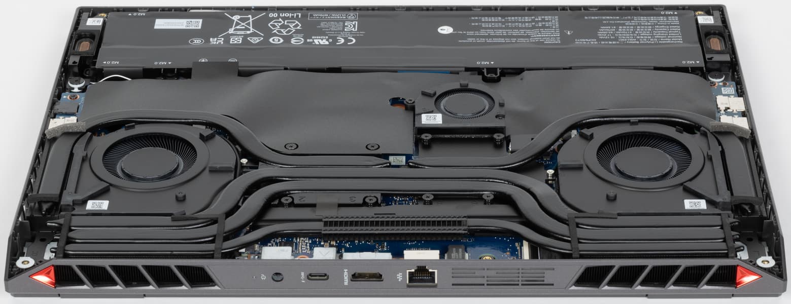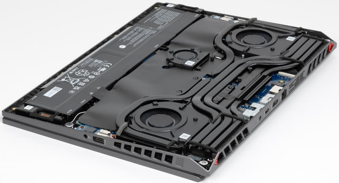 Больше всего места внутри ноутбука занимает системная плата с кулерами, остальное отведено под батарею, по бокам которой находятся динамики.