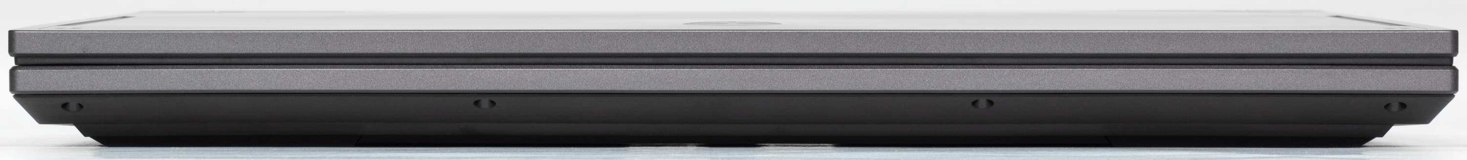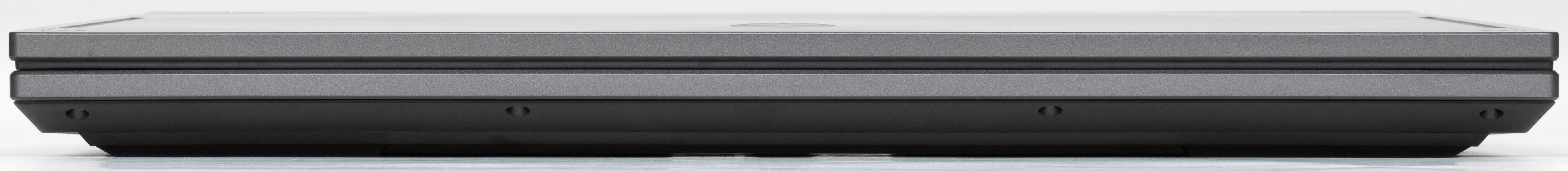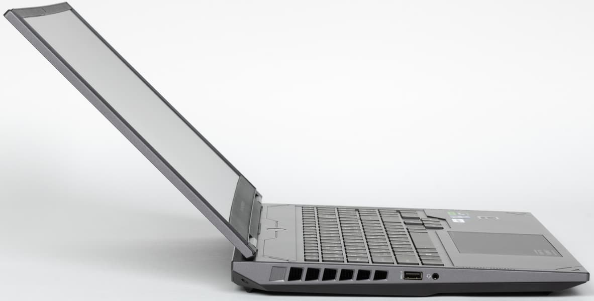 Наши измерения показали совпадение с обозначенными в официальных источниках длиной и шириной, но с толщиной, как обычно, есть разночтения, причем в данном случае весьма существенные: заявленные 24 мм — это лишь у самого скоса передней кромки (да и то, если быть точным, там 24,5 мм), с расположенной рядом ножкой получается 30,5 мм. В самом толстом месте, ближе к заднему торцу, штангенциркуль показывает 32 мм, а задняя ножка добавляет до 37,8 мм. Надо сказать, что даже для не отличающихся особой «стройностью» игровых ноутбуков это много.