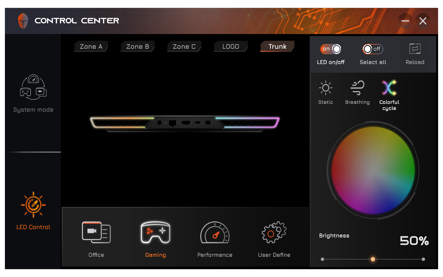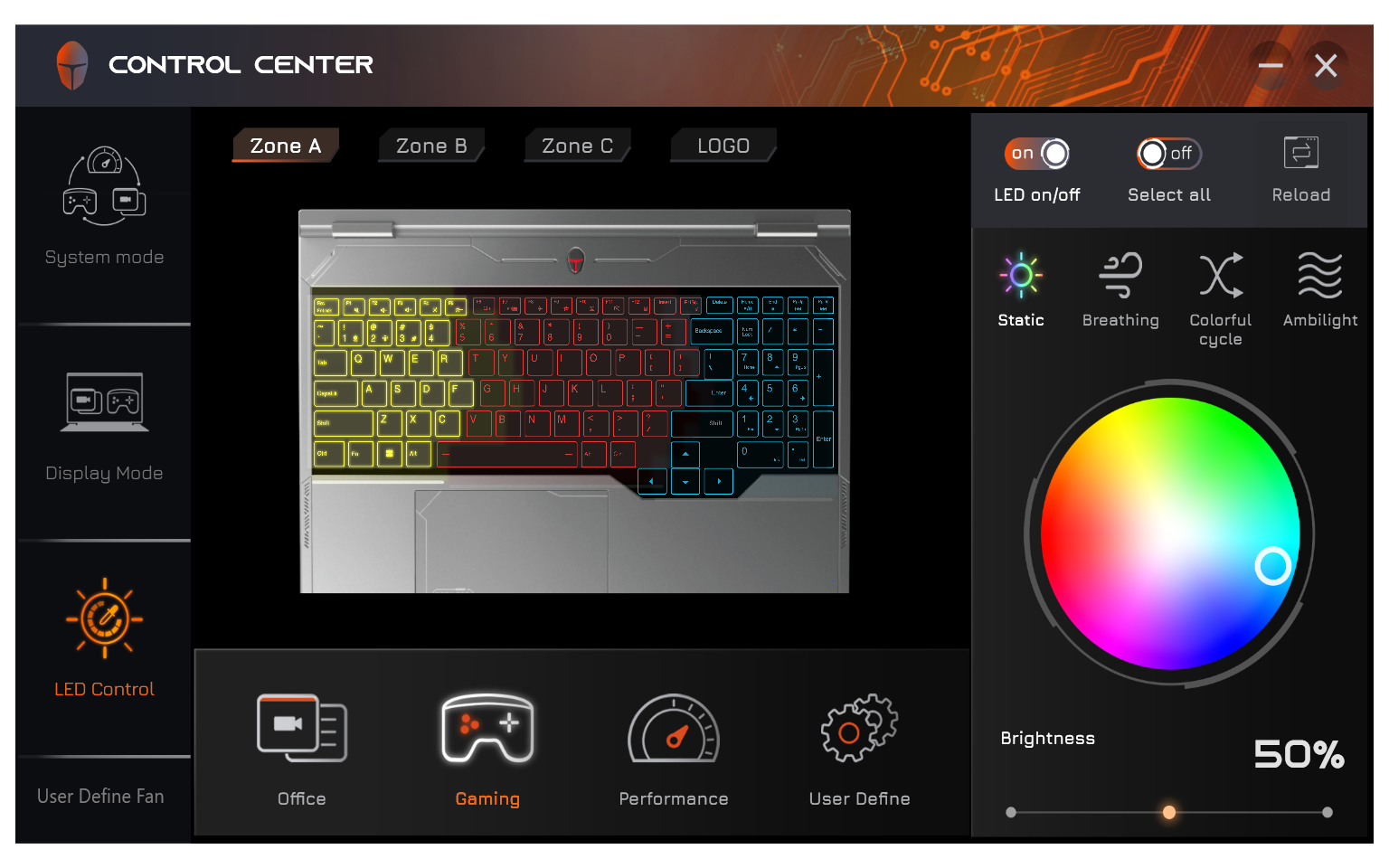 Еще одна функция утилиты — управление RGB-подсветкой раздельно для трех зон клавиатуры и логотипа на наружной части крышки с экраном. Можно выбирать цвета, яркость и эффекты.