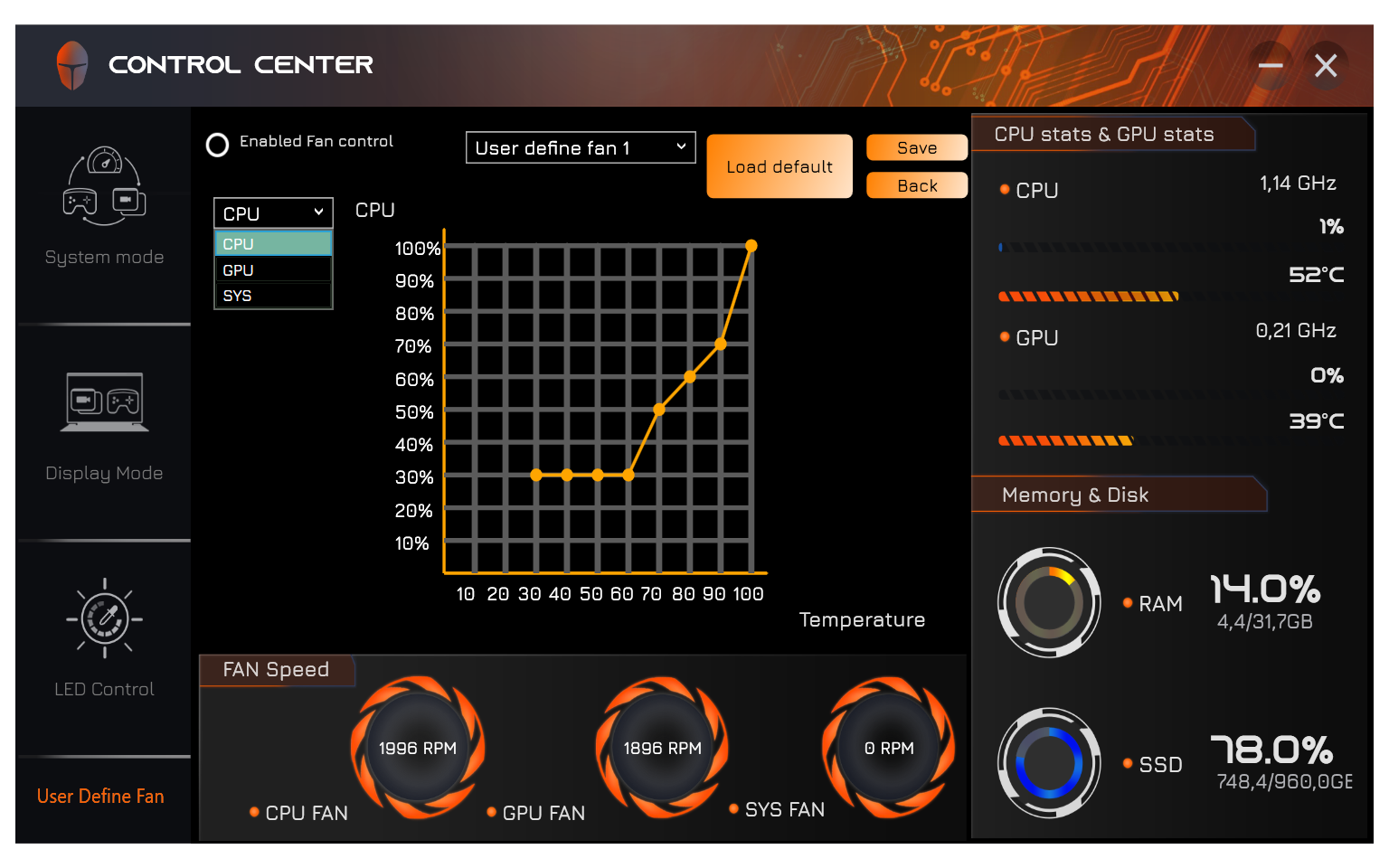 Для вентиляторов можно включить пользовательскую установку, задав раздельно для CPU, GPU и Sys вид кривых зависимости скорости вращения (в процентах от максимума) от температуры (в градусах Цельсия), а потом сохранить для последующего вызова.
