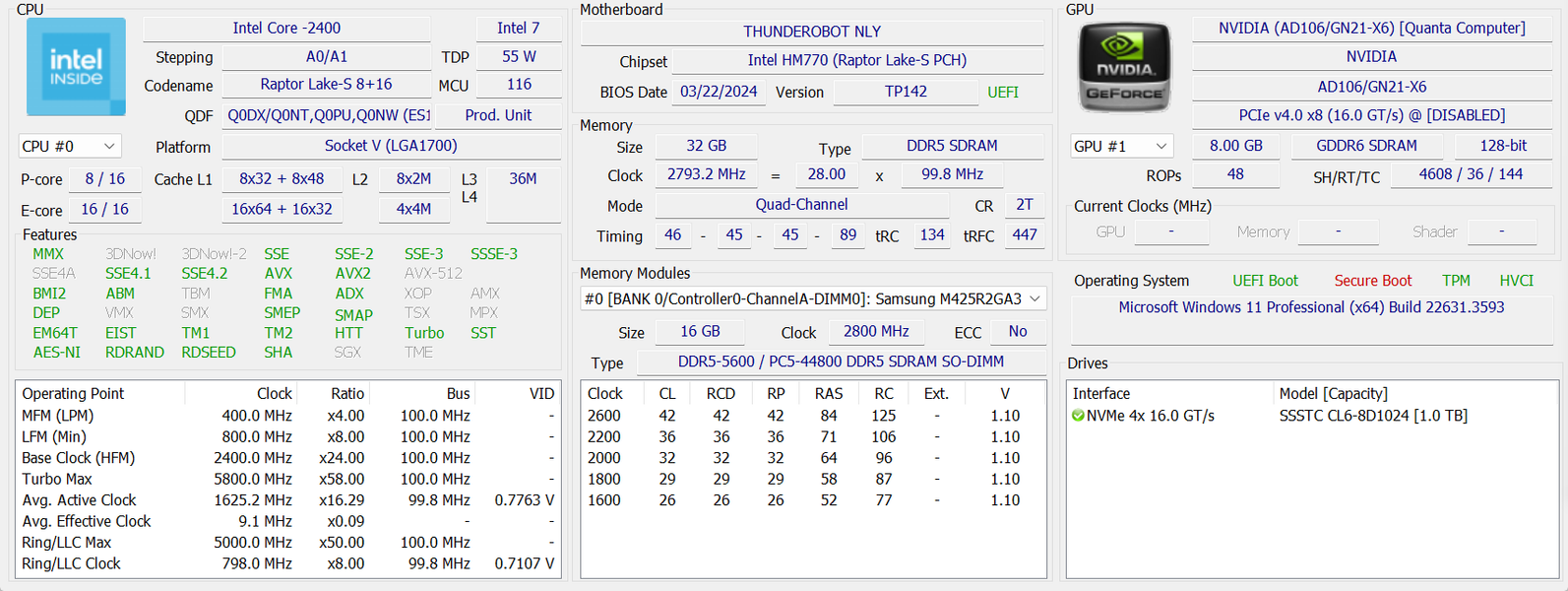 - Asus ROG Zephyrus G16 с процессором Intel Core Ultra 9 185H (6 P-ядер/12 потоков + 10 E-ядер, до 5,1 ГГц, TDP 45—55/157 Вт), графикой Nvidia GeForce RTX 4090 Laptop , памятью 32 ГБ LPDDR5X и накопителем 1 ТБ Samsung PM9A1 PCIe 4.0 x4,