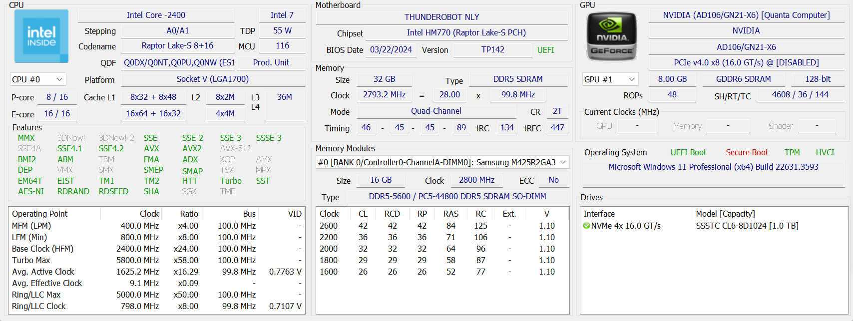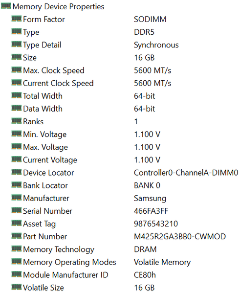 | Оперативная память | 32 (2×16) ГБ DDR5-5600 (2 × Samsung M425AR2GA3BB0-CWMOD) оба слота SO-DIMM заняты | |