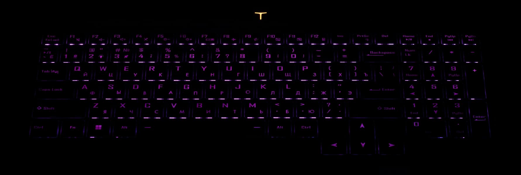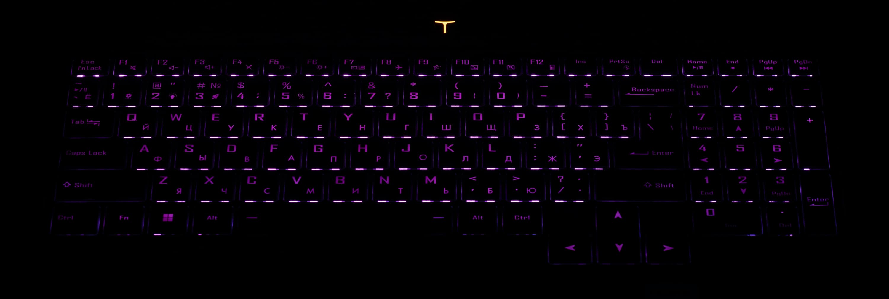 Имеется RGB-подсветка, включение-отключение которой и выбор одного из двух уровней яркости производится необычно — сочетанием Fn и кнопки с двойкой, на которой дополнительно изображена лампочка. Подсвечиваются и символы (включая кириллицу), и края клавиш, а для выбора цвета потребуется установка фирменной утилиты (об этом ниже). Автоматического отключения подсветки после некоторого интервала бездействия нет.