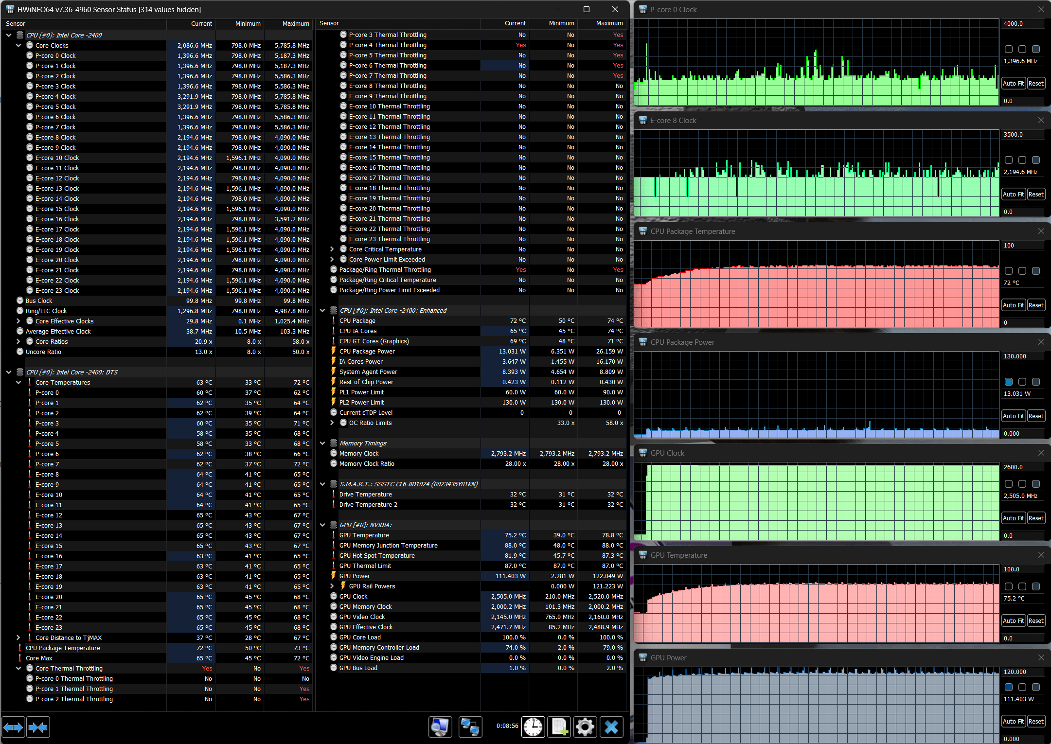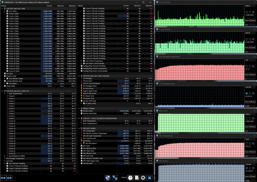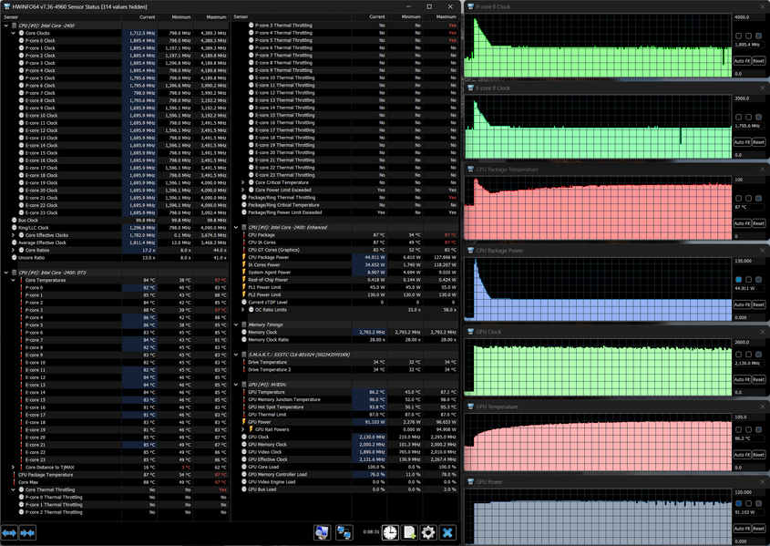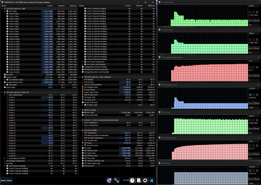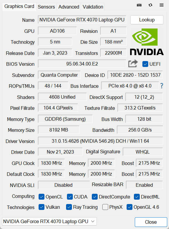 Напомним: используемая в данной модели дискретная видеокарта относится к серии Nvidia GeForce RTX 40 в версии для ноутбуков (архитектура Ada Lovelace), для GeForce RTX 4070 ее производитель заявляет наличие 4608 ядер, 128-разрядную шину памяти с подключением 8 ГБ ОЗУ GDDR6, тактовую частоту (с ускорением) 1230—2175 МГц и потребление 35—115 Вт. В официальных параметрах ноутбука заявлено иное потребление — до 140 Вт, но в тестах мы видели лишь 124 Вт, да и то кратковременно, а частота могла достигать и 2,5 ГГц, причем длительно.
