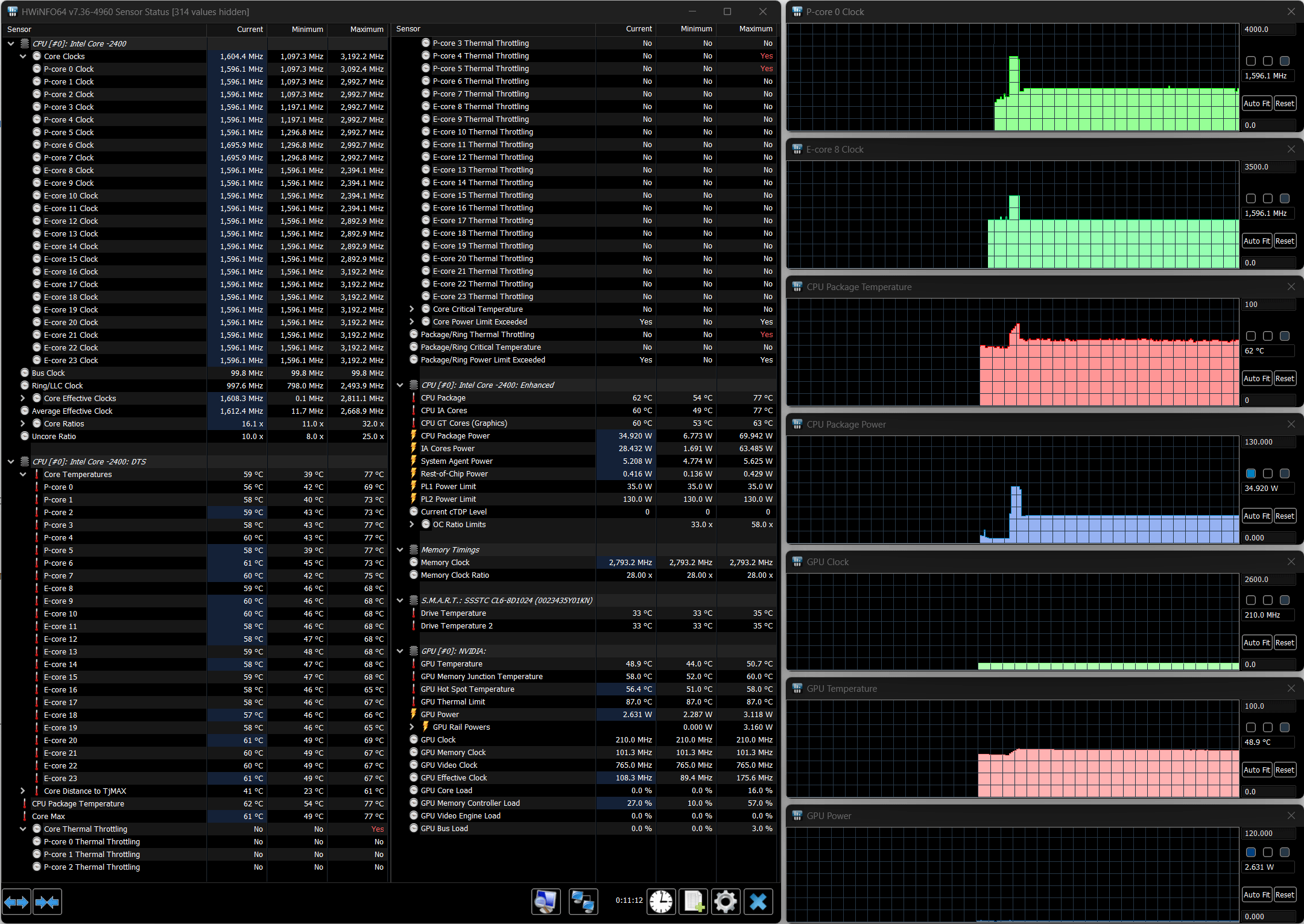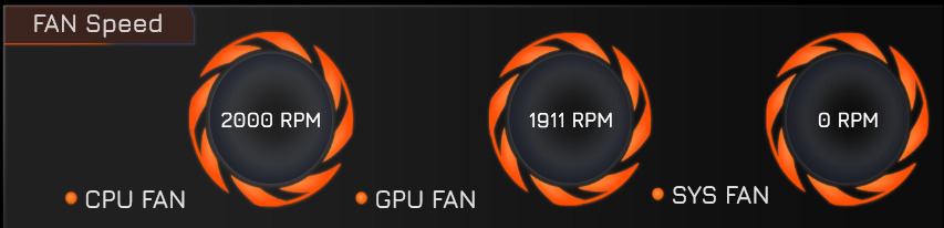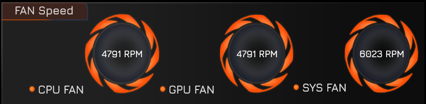 Изменение состояния вентиляторов отображается с существенной, до 10-15 секунд, задержкой. Можно увидеть, что минимальные скорости для кулеров CPU и GPU составляют около 2000 оборотов в минуту, максимальные (по нажатию комбинации Fn + 1) ближе к 4800 об/мин. Третий вентилятор, названный системным (Sys Fan), меняет скорость от нуля до 6000 об/мин.