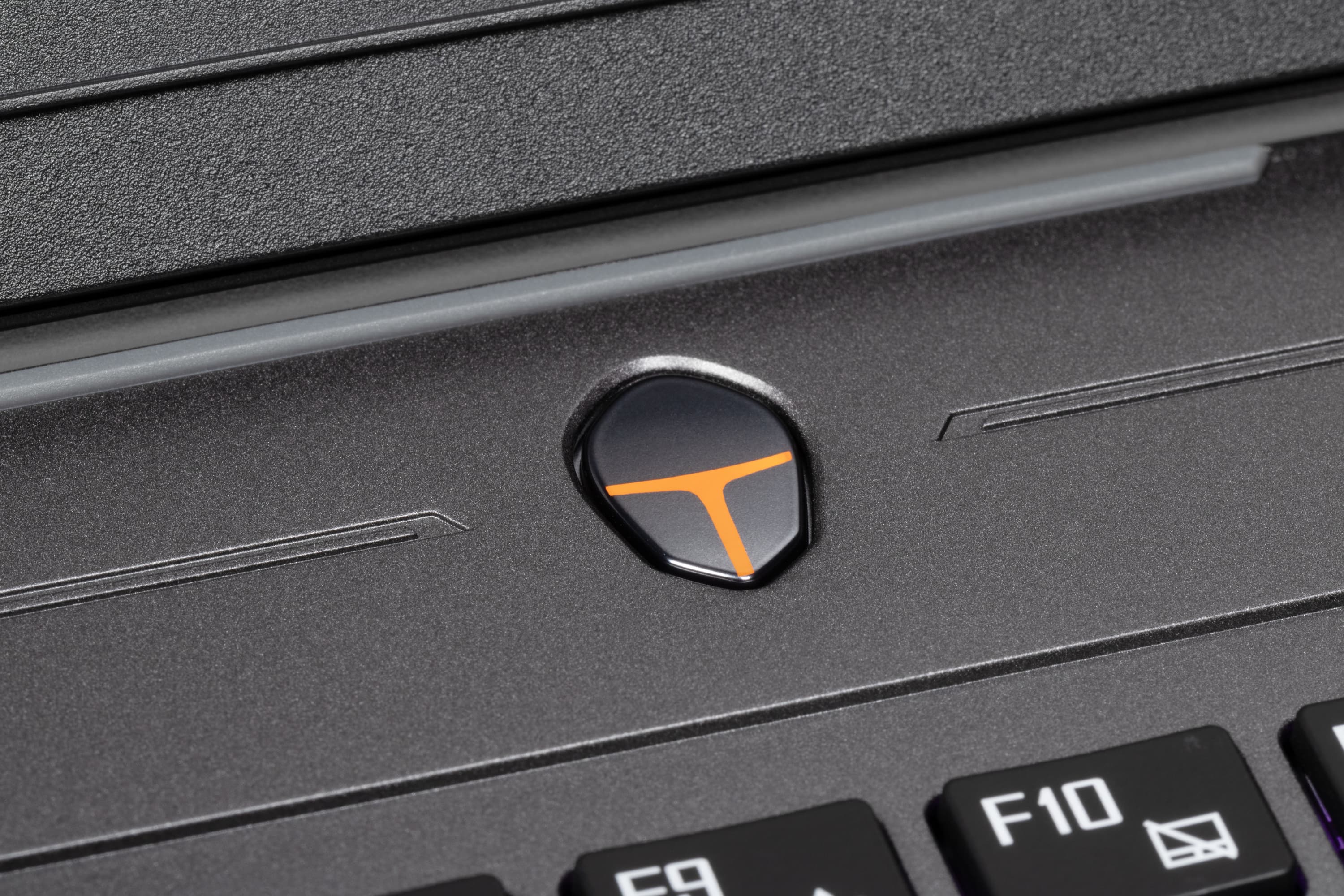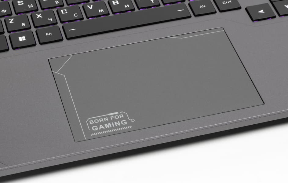 Оформление корпуса по меркам игровых ноутбуков скорее строгое: графитово-серый цвет поверхностей и минимум декоративных элементов, в числе которых ненавязчивый рельефный узор, подсвечиваемый щиток логотипа на верхней крышке и две малинового цвета треугольные вставки на заднем торце.