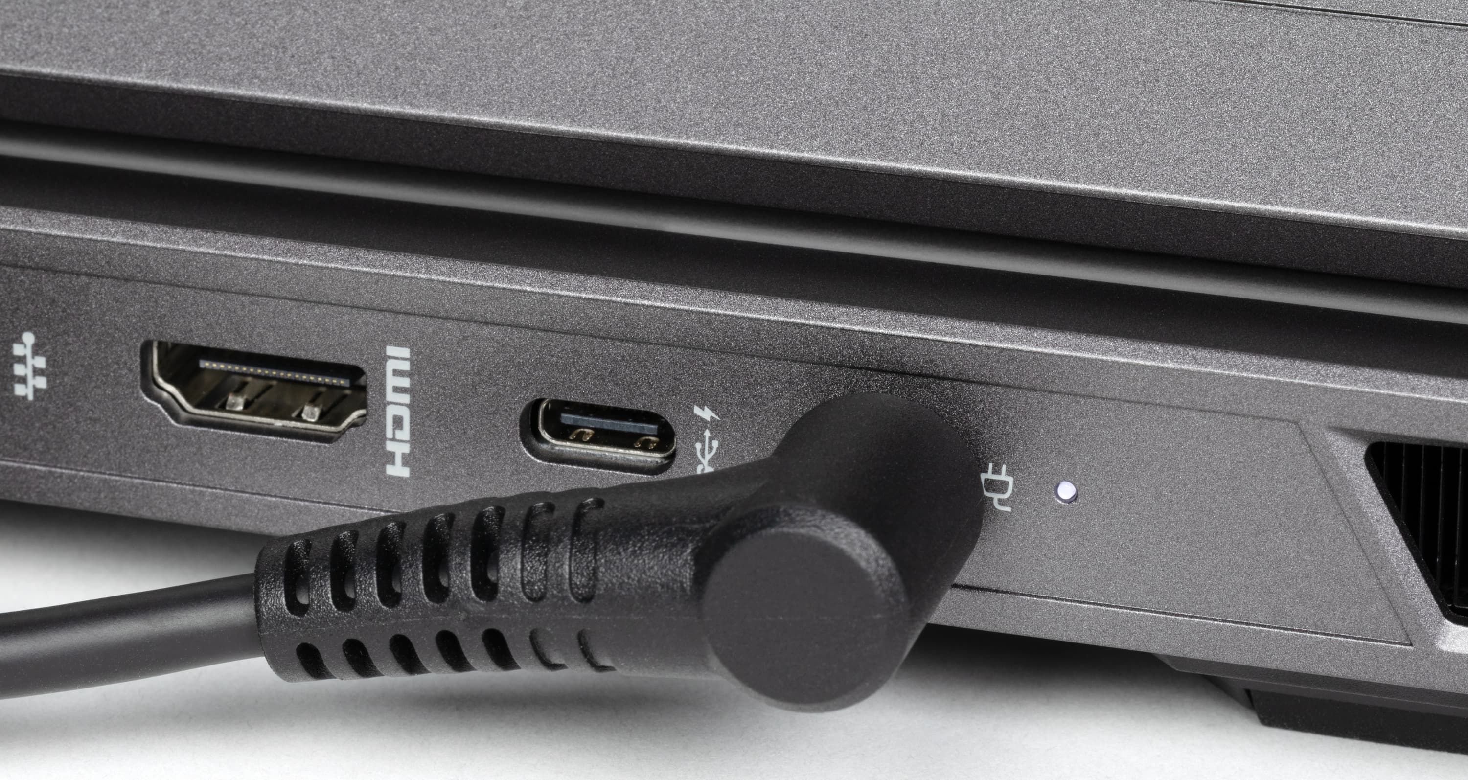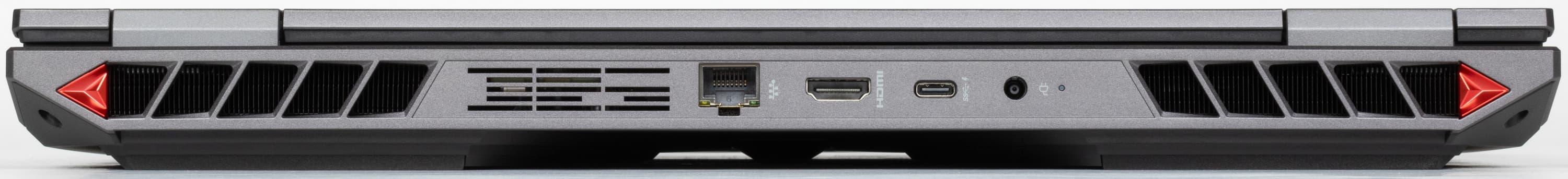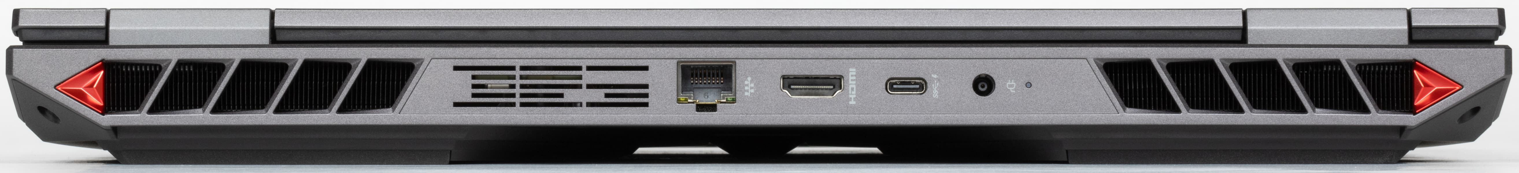 На заднем торце имеются гнездо питания с индикатором зарядки, порты USB3 Type-C (с поддержкой Power Delivery и вывода видеосигнала), HDMI и RJ-45 (оба полноразмерные). В спецификации на сайте упомянут еще «Mini DP 1.4», но реально такого разъема нет (вероятно, имеется в виду все-таки вывод видео через USB Type-C, но тогда непонятно, к чему конкретика типа разъема «Mini»).