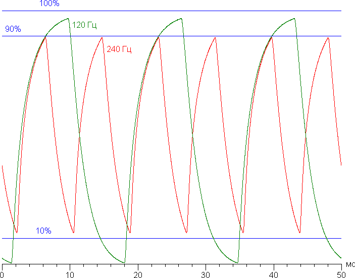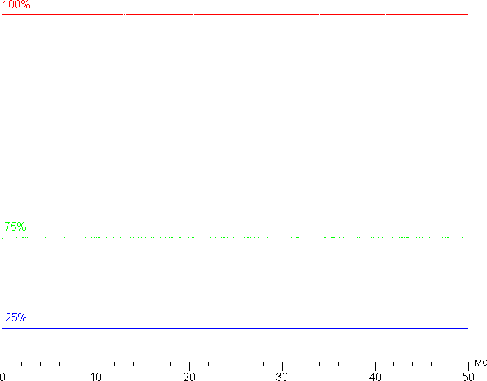 На любом уровне яркости значимая модуляция подсветки отсутствует, поэтому нет и никакого мерцания экрана (нет ШИМ). В доказательство приведем графики зависимости яркости (вертикальная ось) от времени (горизонтальная ось) при различных значениях настройки яркости: