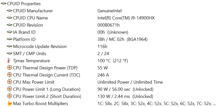 | Процессор | Intel Core i9-14900HX (8+16 ядер/32 потока, 2,2—5,8/1,6—4,1 ГГц, 45—55/157 Вт) | |
