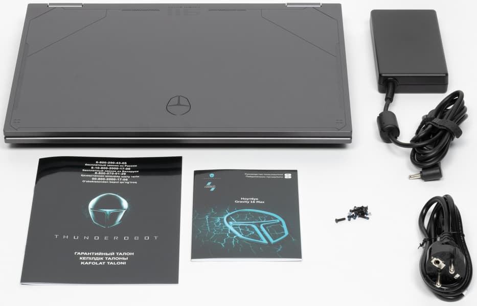 В комплекте, кроме самого ноутбука, идет блок питания со сменным входным кабелем и распаянным выходным (1,7 м, есть фиксатор-«липучка»), набор винтов — например, для крепления дополнительного накопителя (мелочь, а приятно), а также печатные материалы на русском языке.