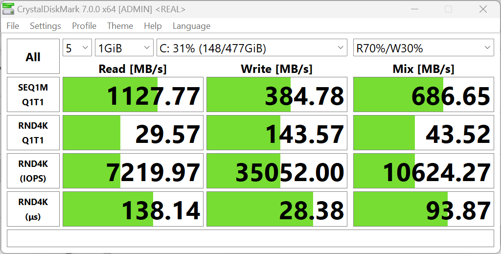 Есть, впрочем, и слабая сторона, которая заметно понижает достигнутое — она связана с выявленным несовершенством системного накопителя, интегральный результат которого составляет лишь 27 баллов — это втрое ниже, чем у референсного настольного ПК с накопителем SATA SSD и в 14 раз хуже, чем у лидера состязаний Intel NUC.