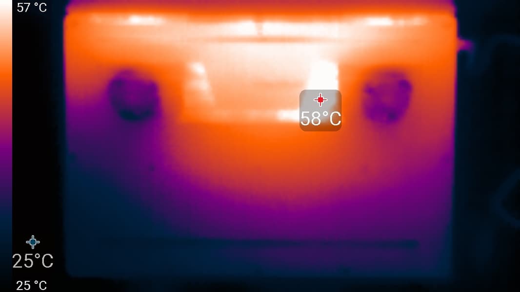 Сзади подробности не видны, но между петлей крышки и основанием имеются щели для выброса нагретого воздуха, скрытые за угловым уступом.