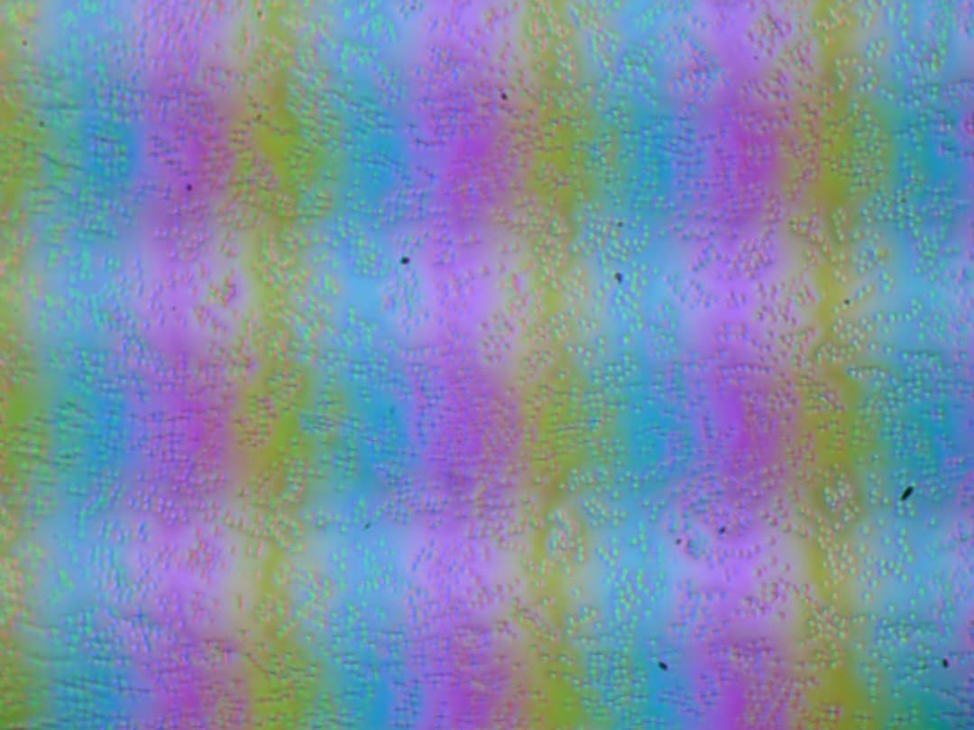 Зерно этих дефектов в несколько раз меньше размеров субпикселей (масштаб этих двух фотографий примерно одинаковый), поэтому фокусировка на микродефектах и «перескок» фокуса по субпикселям при изменении угла зрения выражены слабо, из-за этого нет и «кристаллического» эффекта.