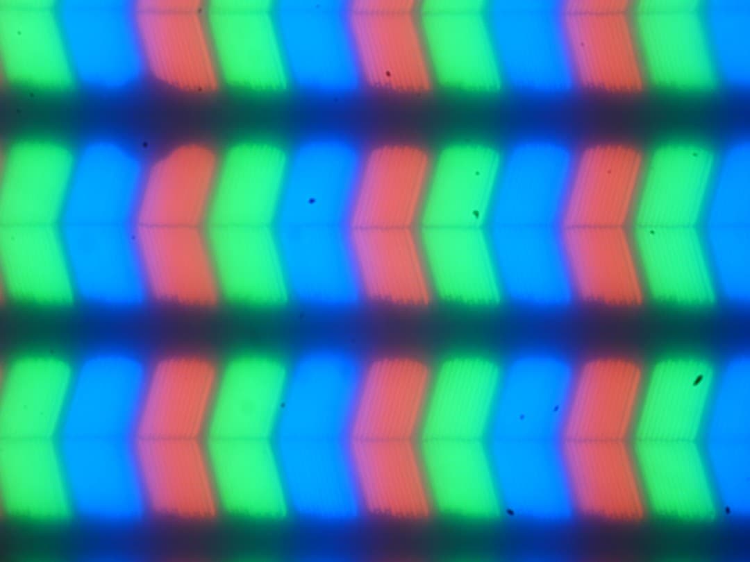 В этом ноутбуке используется матрица типа IPS. Микрофотографии демонстрируют типичную для IPS структуру субпикселей (черные точки — это пыль на матрице фотоаппарата):