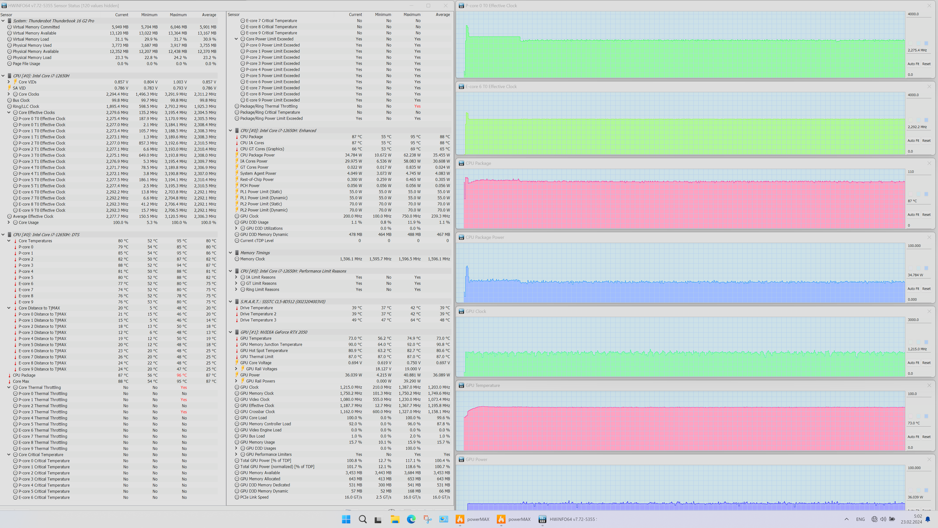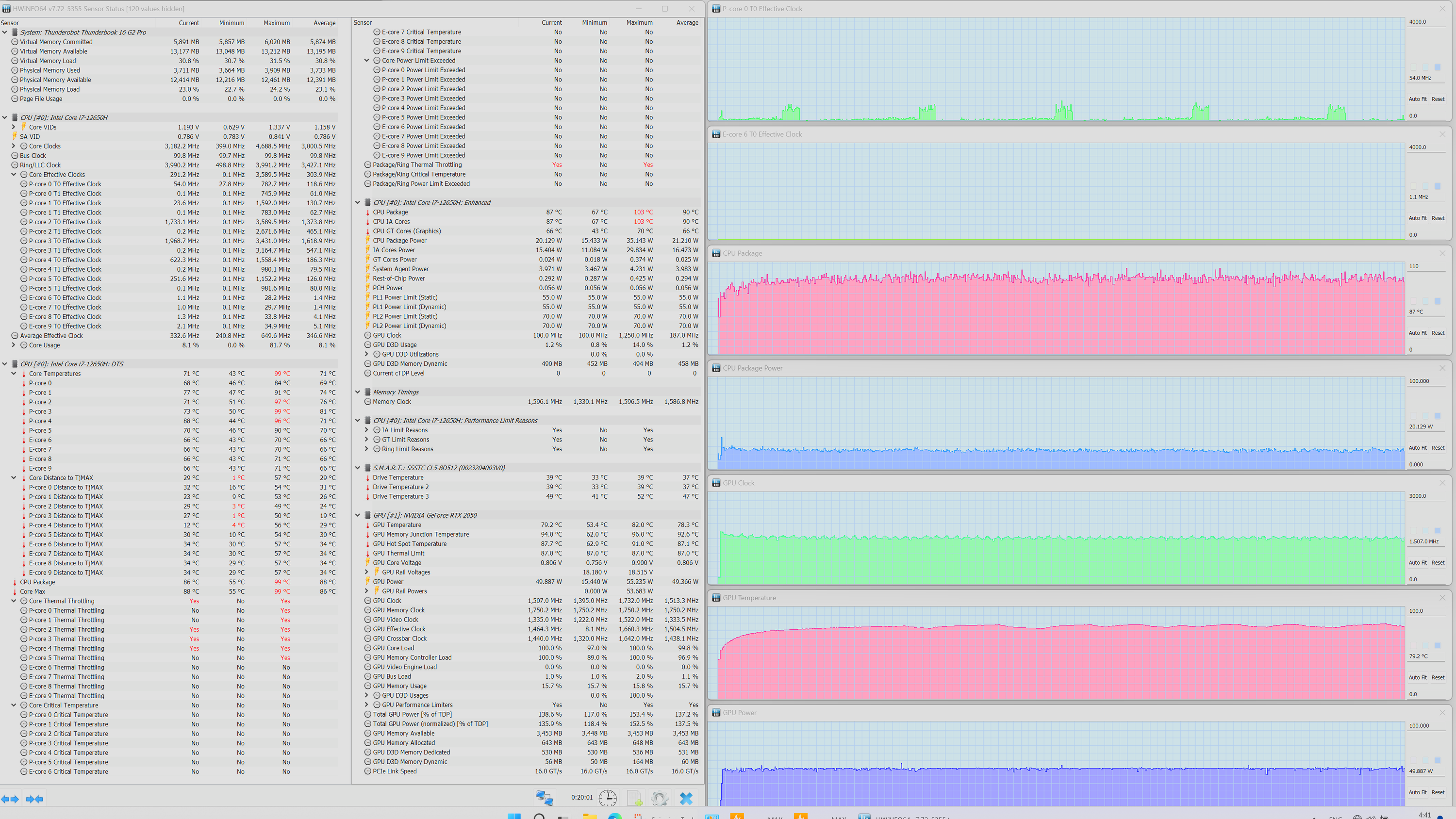 Мы испытали мобильный ПК, ставший следствием аппаратной гибридизации. Внешне это типичная бизнес-модель с относительно тонким корпусом, изготовленным из магниевого сплава, характерным расположением разъемов и портов справа и слева и выходным трактом системы охлаждения в щели между задней панелью и выступом крышки. В аппаратном оснащении главенствуют процессор Intel Core i7-12650H и — внимание! — дискретная видеокарта Nvidia GeForce RTX 2050 Laptop с 4 ГБ GDDR6. Экран размером 16 дюймов по диагонали обладает разрешением 2.5K при соотношении сторон 16:10 (это более удобно для офисной работы) с хорошей максимальной яркостью. Объем оперативной памяти 16 ГБ набран двумя модулями SO-DIMM в двух слотах. Вывод видео производится через HDMI и два порта USB 3.2 Gen2, поэтому к устройству можно одновременно подключить три внешних монитора. Из традиционно деловых аксессуаров доступна веб-камера (720p) без механической шторки, а вот сканером отпечатков пальцев машина не оснащена. Системный накопитель SSST/Kioxia CL5-8D512 вместимостью 512 ГБ хотя и подключен к PCIe 4 ×4, но демонстрирует скорости файловых операций, более присущие жесткому диску, чем NVMe. Он является главным источником сложностей при оценке производительности ноутбука в реальных приложениях, поскольку портит хорошие показатели быстродействия своей чересчур медленной работой.