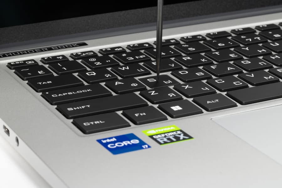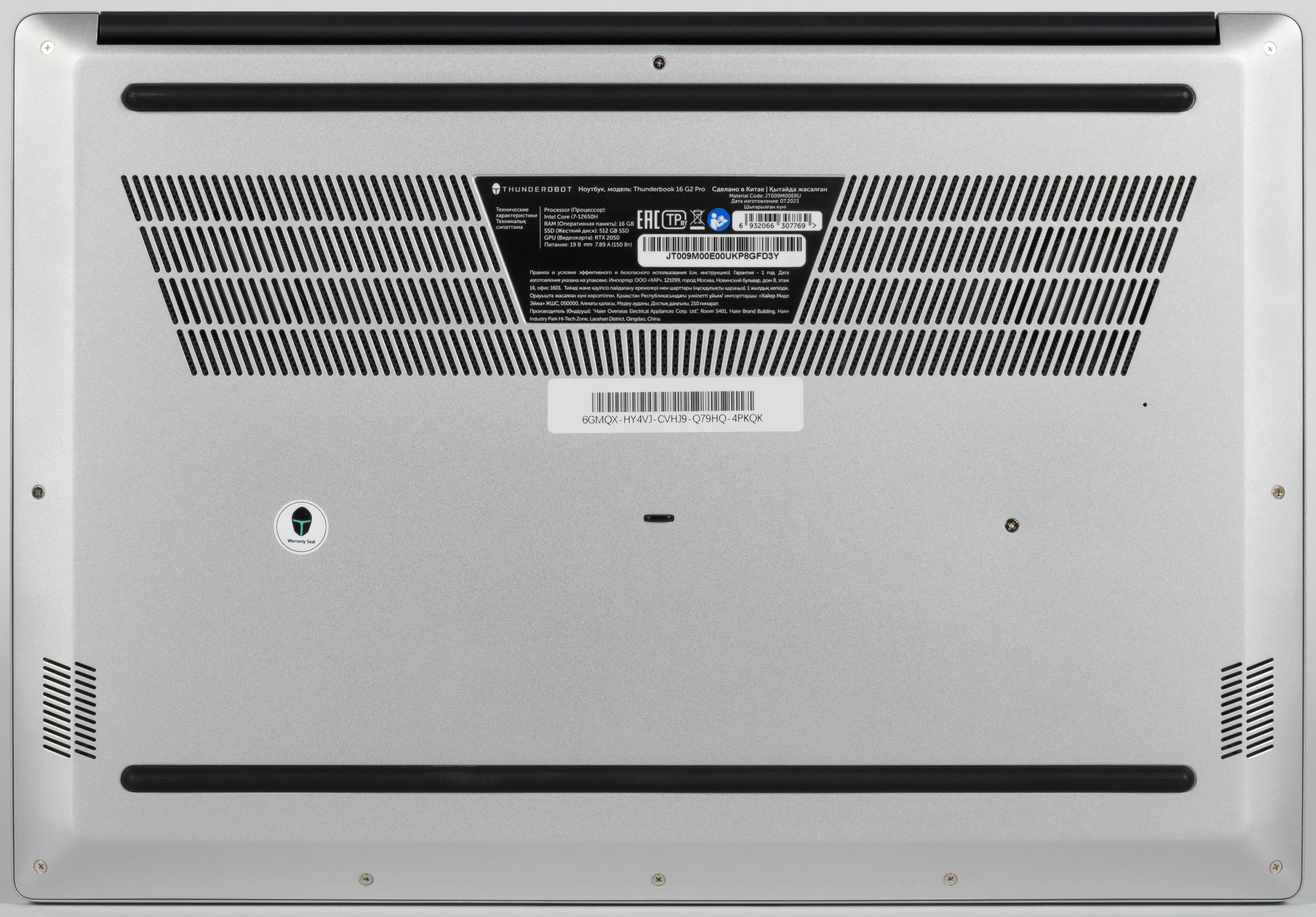 Днище крепится к корпусу Thunderobot Thunderbook 16 G2 Pro при помощи двенадцати винтов. Один из них заклеен заводским стикером.