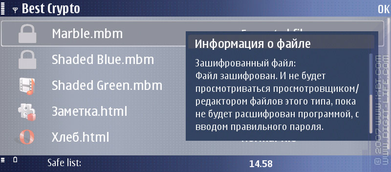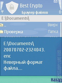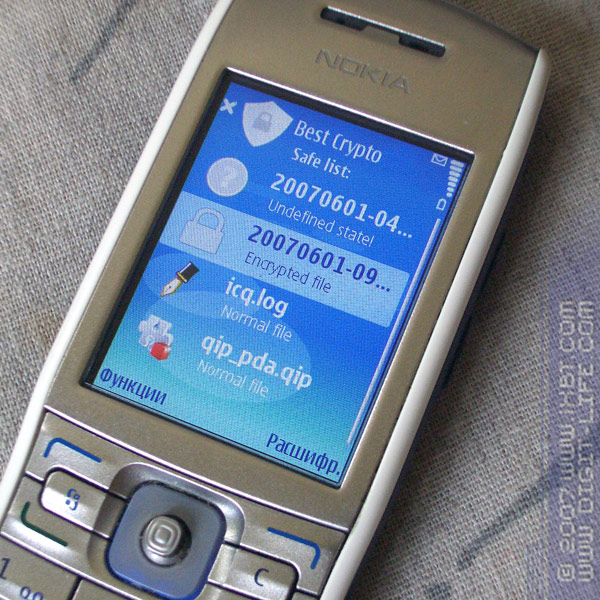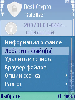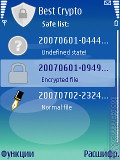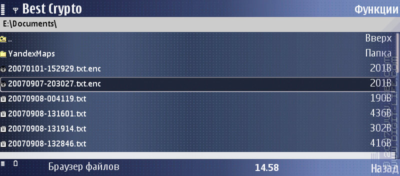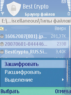 В программу встроен свой менеджер файлов, с помощью которого и предлагается бродить по «дискам», выбирать нужные файлы и зашифровывать их. Этот файловый менеджер, в отличие от многих других, помимо папок «private» и «sys», не видит еще и папки «system» и «resource». А также, что вполне логично, в нем не отображается диск «Z:» (ROM), хотя и не очень понятно, зачем сделали доступ к диску «D:» (RAM). Один из способов работы с программой — выбрать в меню пункт «Браузер файлов», добраться до нужного места и зашифровать файлы. Недостаток браузера — неумение обрабатывать указанную папку или группу папок: приходится открывать папки и работать уже с группами файлов.